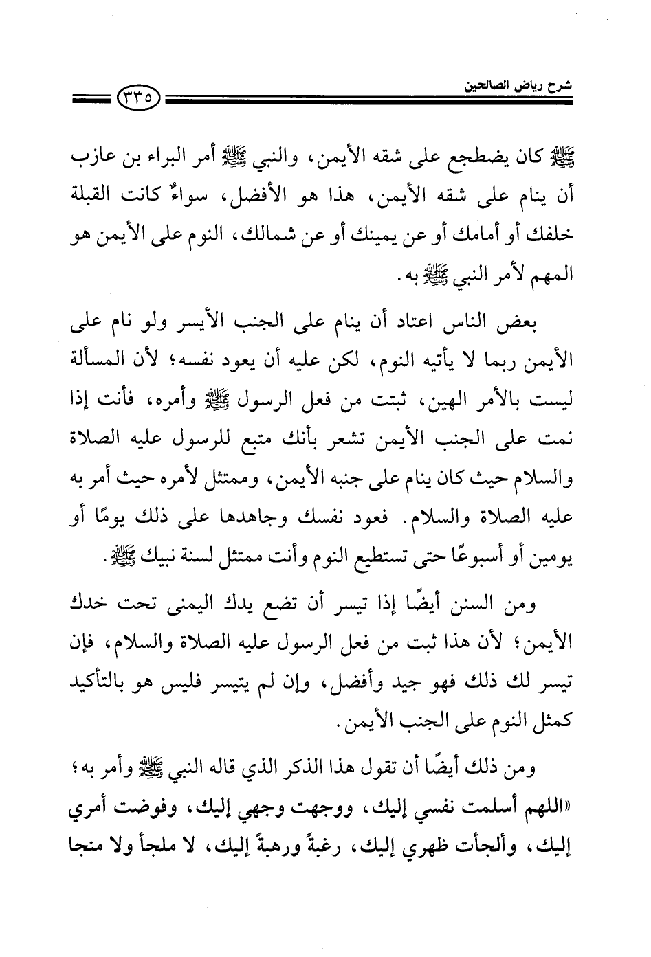 ومن السنن أيضا إذا تيسر أن تضع يدك اليمنى تحت خدك الأيمن لأن هذا ثبت من فعل الرسول عليه الصلاة والسلام فإن تيسر لك ذلك فهو جيد وأفضل وإن لم يتيسر فليس هو بالتأكيد كمثل النوم على الجنب الأيمن ومن ذلك أيضا أن تقول هذا الذكر الذي قاله النبي صلى الله عليه وسلم وأمر به اللهم أسلمت نفسي إليك ووجهت وجهي إليك وفوضت أمري إليك وألجأت ظهري إليك رغبة ورهبة إليك لا ملجأ ولا منجا