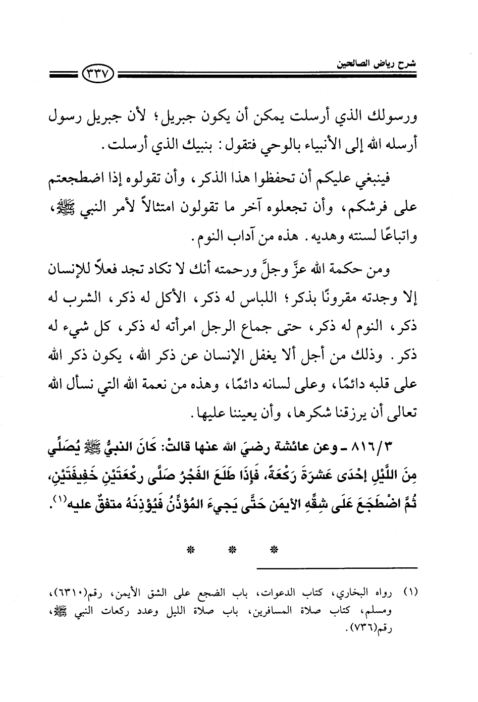 816 - وعن عائشة رضي الله عنها قالت: كان النبي صلى الله عليه وسلم يصلى من الليل إحدى عشرة ركعة فإذا طلع الفجر صلى ركعتين حفيفتين ثم اضطجع على شقه الأيمن حتى يجيء المؤذن فيؤذنه متفق عليه