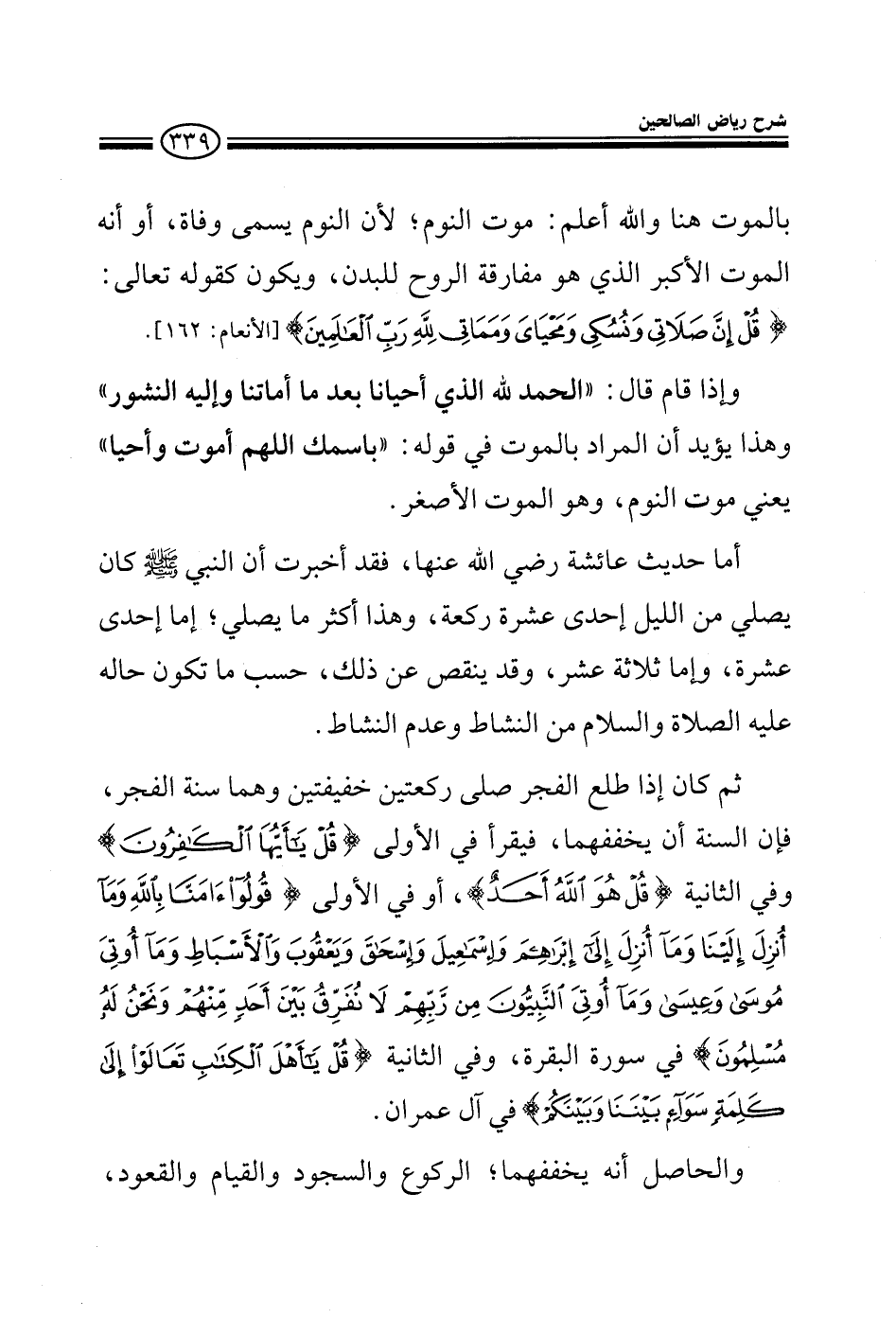 بالموت هنا والله أعلم موت النوم لأن النوم يسمى وفاة أو أنه الموت الأكبر الذي هو مفارقة الروح للبدن ويكون كقوله تعالى: قُلْ إِنَّ صَلاَتِي وَنُسُكِي وَمَحْيَايَ وَمَمَاتِي للهِ رَبِّ الْعَالَمِينَ وإذا قام قال: الحمد لله الذي أحيانا بعد ما أماتنا وإليه النشور وهذا يؤيد أن المراد بالموت في قوله: باسمك اللهم أموت وأحيا يعني موت النوم وهو الموت الأصغر أما حديث عائشة رضي الله عنها فقد أخبرت أن النبي صلى الله عليه وسلم كان يصلي من الليل إحدى عشرة ركعة وهذا أكثر ما كان يصلي إما إحدى عشرة وإما ثلاثة عشر وقد ينقص عن ذلك حسب ما تكون حاله عليه الصلاة والسلام من النشاط وعدم النشاط ثم كان إذا طلع الفجر صلى ركعتين خفيفتين وهما سنة الفجر فإن السنة أن يخففها فيقرأ في الأولى: {قل يا أيها الكافرون} وفي الثانية {قل هو الله أحد} أو في الأولى {قولوا آمنا بالله وما أنزل إلينا} إلى آخر الآية في سورة البقرة وفي الثانية {قل يا أهل الكتاب تعالوا إلى كلمة سواء بيننا وبينكم} في آل عمران والمهم أن يخففهما فيخفف الركوع والسجود والقيام والقعود