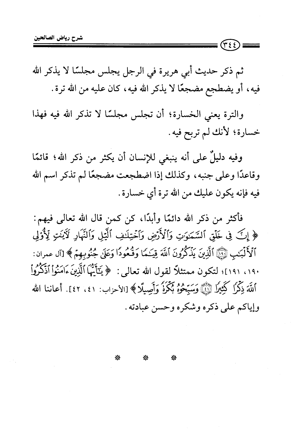 ثم ذكر حديث أبي هريرة في الرجل يجلس مجلسا لا يذكر الله فيه أو يضطجع مضطجعا لا يذكر الله فيه كان عليه من الله ترة والترة يعني الخسارة أن تجلس مجلسا لا تذكر الله فيه فهذا خسارة لأنك لم تربح فيه وفيه دليل على أنه ينبغي للإنسان أن يكثر من ذكر الله قائما وقاعدا وعلى جنبه وكذلك إذا اضطجعت مضطجعا لم تذكر اسم الله فيه فإنه يكون عليك من الله ترة أي خسارة فأكثر من ذكر الله دائما وأبدا كن كمن قال الله تعالى فيهم: إِنَّ فِي خَلْقِ السَّمَاوَاتِ وَالأَرْضِ وَاخْتِلاَفِ اللَّيْلِ وَالنَّهَارِ لآَيَاتٍ لأُولِي الألْبَابِ الَّذِينَ يَذْكُرُونَ اللهَ قِيَامًا وَقُعُودًا وَعَلَى جُنُوبِهِمْ لتكون ممتثلا لقول الله تعالى {يَا أَيُّهَا الَّذِينَ آمَنُوا اذْكُرُوا اللهَ ذِكْرًا كَثِيرًا وَسَبِّحُوهُ بُكْرَةً وَأَصِيلاً} أعاننا الله على ذكره وشكره وحسن عبادته