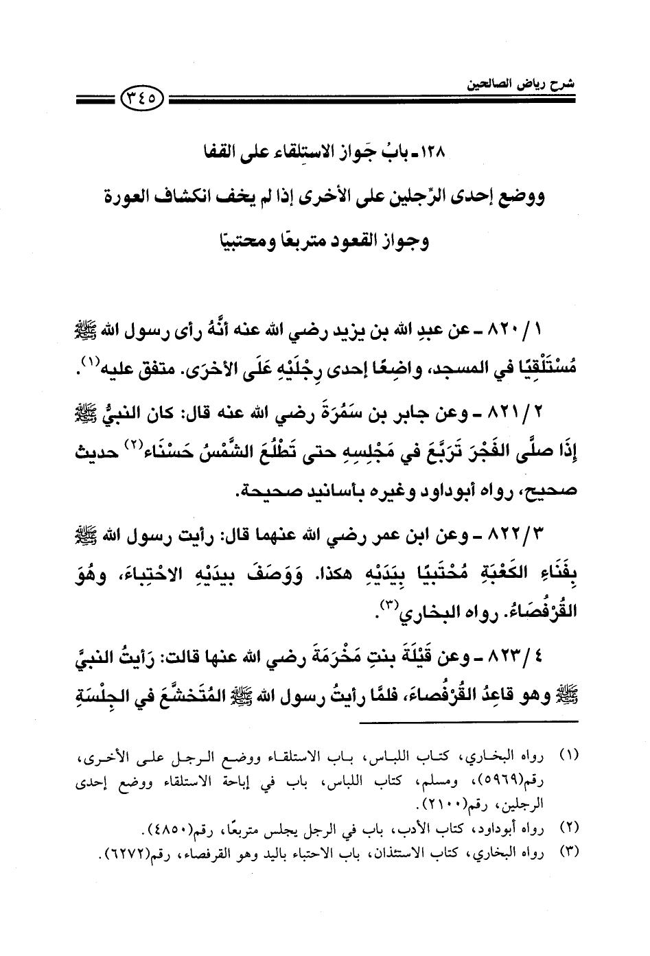 820 - عن عبد الله بن يزيد رضي الله عنهما أنه رأى رسول الله صلى الله عليه وسلم مستلقيا في المسجد واضعا إحدى رجليه على الأخرى متفق عليه