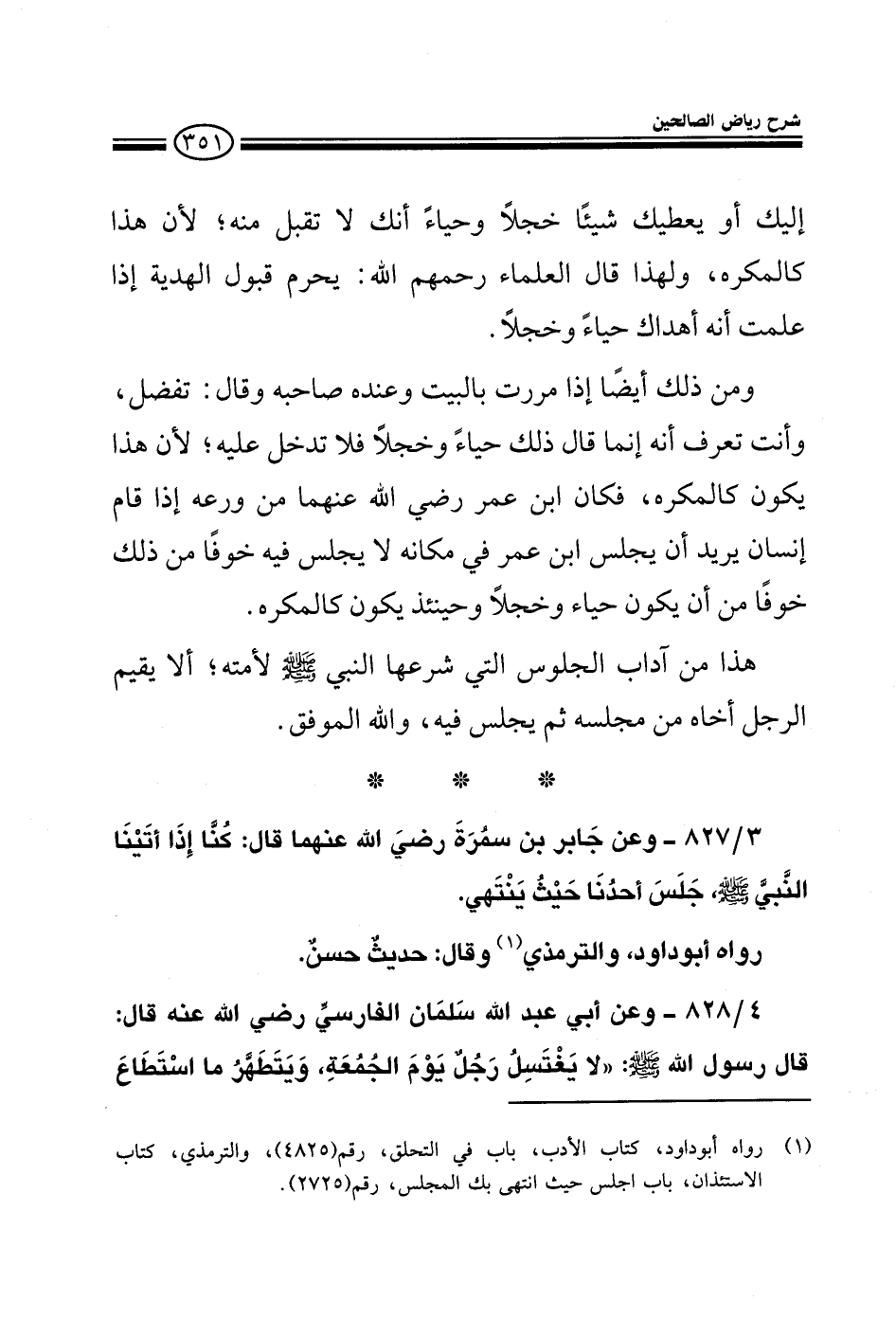 827 - وعن جابر بن سمرة رضي الله عنهما قال: كنا إذا أتينا النبي صلى الله عليه وسلم جلس أحدنا حيث ينتهي رواه أبو داود والترمذي وقال: حديث حسن