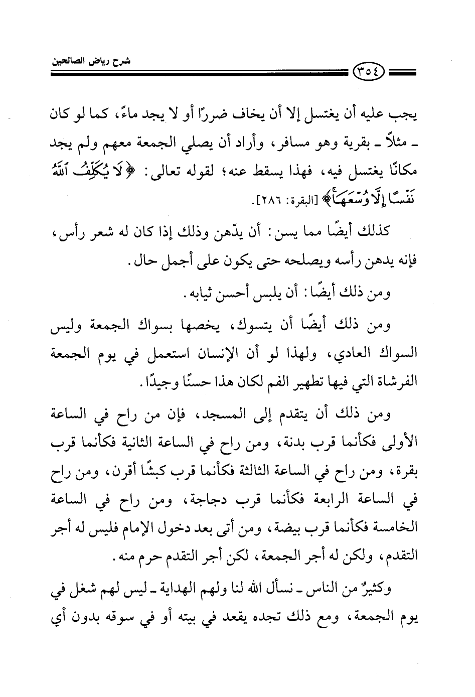 يجب عليه أن يغتسل إلا أن يخاف ضررا أو لا يجد ماء كما لو مر مثلا بقرية وهو مسافر وأراد أن يصلي الجمعة معهم ولم يجد مكانا يغتسل فيه فهذا يسقط عنه لقوله تعالى: لا يكلف الله نفسا إلا وسعها وكذلك أيضا مما يسن في هذا اليوم أن يدهن وذلك إذا كان له شعر رأس فإنه يدهن رأسه ويصلحه حتى يكون على أجمل حال ومن ذلك أيضا أن يلبس أحسن ثيابه ومن ذلك أيضا أن يتسوك يخصها بسواك الجمعة وليس السواك العادي ولهذا لو أن الإنسان استعمل يوم الجمعة الفرشاة التي تطهر الفم لكان هذا حسنا وجيدا ومن ذلك أن يتقدم إلى المسجد فإن من راح في الساعة الأولى فكأنما قرب بدنة ومن راح في الساعة الثانية فكأنما قرب بقرة ومن راح في الساعة الثالثة فكأنما قرب كبشا أقرن ومن راح في الساعة الرابعة فكأنما قرب دجاجة ومن راح في الساعة الخامسة فكأنما قرب بيضة ومن أتى بعد دخول الإمام فليس له أجر التقدم ولكن له أجر الجمعة لكن أجر التقدم حرم منه وكثير من الناس نسأل الله لنا ولهم الهداية ليس لهم شغل في الجمعة ومع ذلك تجده يقعد في بيته أو في سوقه بدون أي