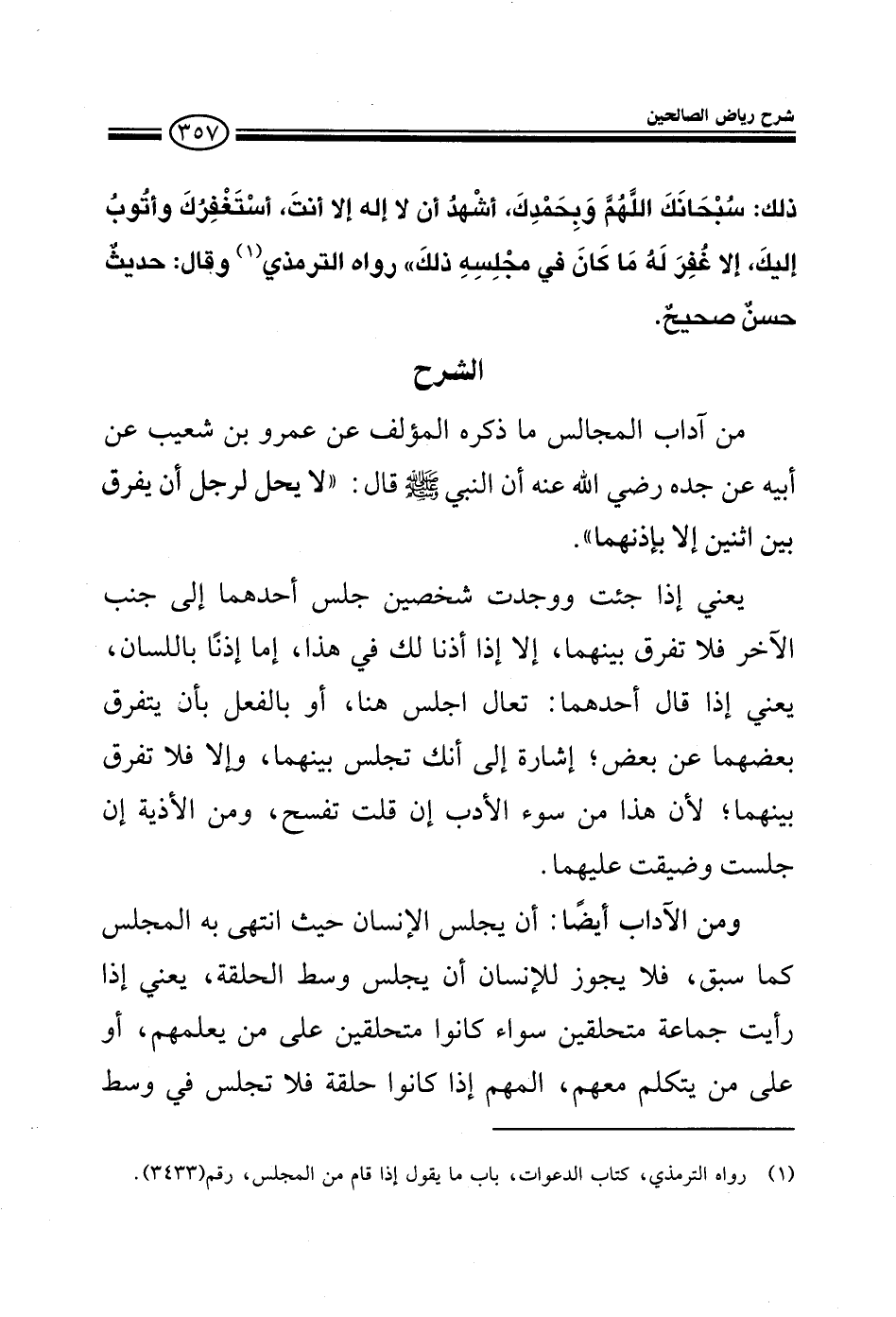 EXومن آداب المجالس ما ذكره المؤلف عن عمرو بن شعيب عن أبيه عن جده رضي الله عنه أن النبي صلى الله عليه وسلم قال: لا يحل لرجل أن يفرق بين اثنين إلا بإذنهما يعني إذا جاءت ووجدت شخصين جلس أحدهما إلى جنب الآخر فلا يفرق بينهما إلا إذا أذنا لك في هذا إما إذنا باللسان يعني إذا قال أحدهما تعال اجلس هنا أو بالفعل بأن يتفرق بعضهما عن بعض إشارة إلى أنك تجلس بينهما وإلا فلا تفرق بينهما لأن هذا من سوء الأدب إن قلت تفسح ومن الأذية إن جلست وضيق عليهما ومن الآداب أيضا أن يجلس الإنسان حيث انتهى به المجلس كما سبق فلا يجوز للإنسان أن يجلس وسط الحلقة يعني إذا رأيت جماعة متحلقين سواء كانوا متحلقين على من يعلمهم أو على من يتكلم معهم المهم إذا كانوا حلقة فلا يجلس في وسط
