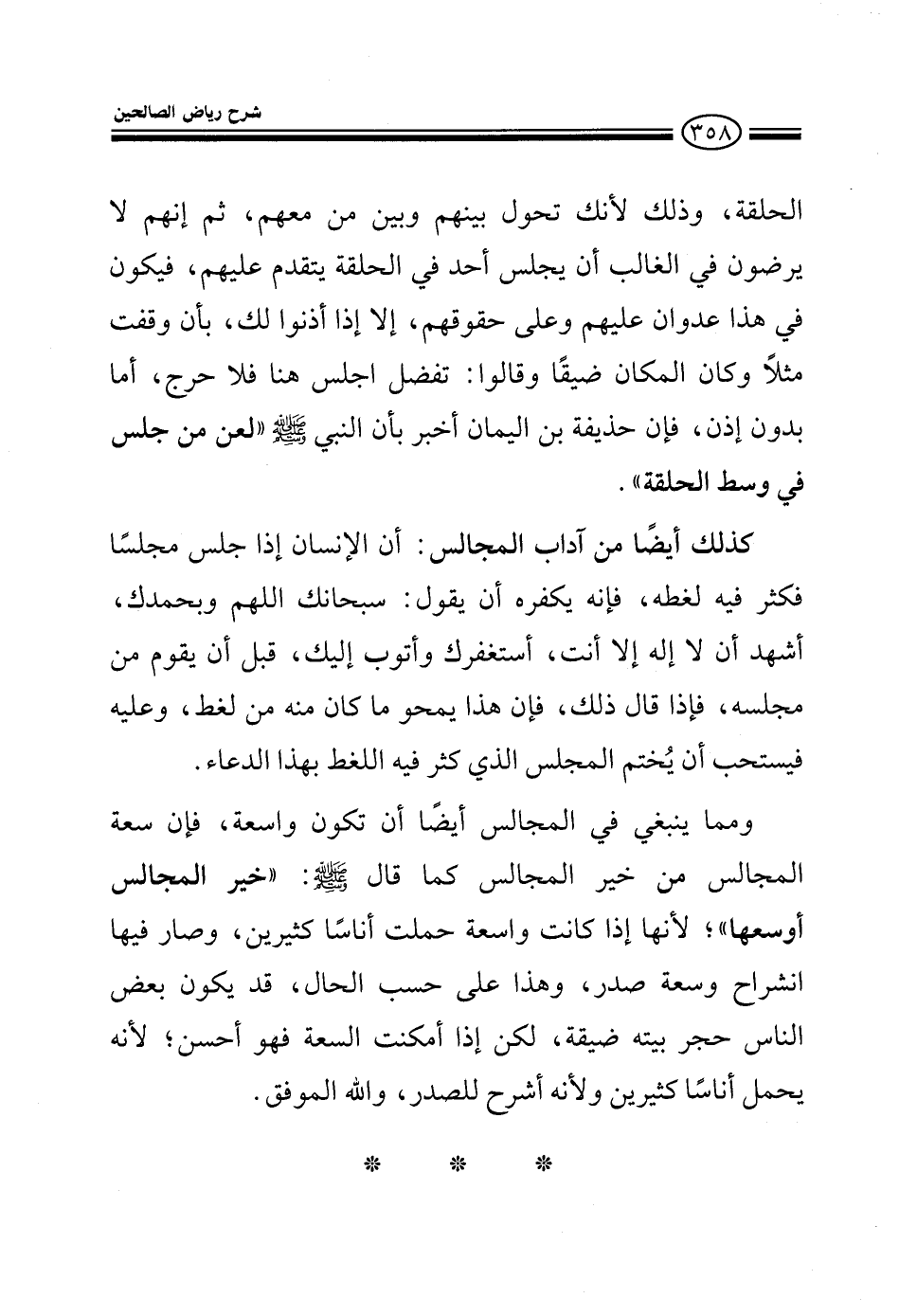 الحلقة وذلك لأنك تحول بينهم وبين من معهم ثم إنهم لا يرضون في الغالب أن يجلس أحد في الحلقة يتقدم عليهم فيكون في ذلك عدوان عليهم وعلى حقوقهم إلا إذا أذنوا لك بأن وقفت مثلا وكان المكان ضيقا وقالوا تفضل اجلس هنا فلا حرج أما بدون إذن فإن حذيفة بن اليمان أخبر بأن النبي صلى الله عليه وعلى آله وسلم قال لعن من جلس في وسط الحلقة كذلك أيضا من آداب المجالس: أن الإنسان إذا جلس مجلسا فكثر فيه لغطه فإنه يكفره أن يقول: سبحانك اللهم وبحمدك أشهد أن لا إله إلا أنت أستغفرك وأتوب إليك قبل أن يقوم من مجلسه فإذا قال ذلك فإن هذا يمحو ما كان منه من لغط وعليه فيستحب أن يختم المجلس الذي كثر فيه اللغط بهذا الدعاء: سبحانك اللهم وبحمدك أشهد أن لا إله إلا أنت أستغفرك وأتوب إليك ومما ينبغي في المجالس أيضا أن تكون واسعة فإن سعة المجالس من خير المجالس كما قال صلى الله عليه وسلم: خير المجالس أوسعها لأنها إذا كانت واسعة حملت أناسا كثيرين وصار فيها انشراح وسعة صدر وهذا على حسب الحال قد يكون بعض الناس حجر بيته ضيقة لكن إذا أمكنت السعة فهو أحسن لأنه يحمل أناسا كثيرين ولأنه أشرح للصدر