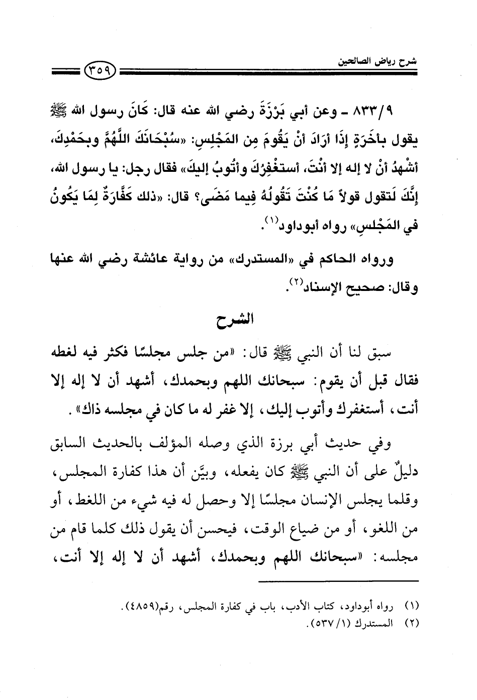833 - وعن أبي برزة رضي الله عنه قال: كان رسول الله صلى الله عليه وسلم يقول بآخرة إذا أراد أن يقوم من المجلس: سبحانك اللهم وبحمدك أشهد أن لا إله إلا أنت أستغفرك وأتوب إليك فقال رجل يا رسول الله إنك لتقول قولا ما كنت تقوله فيما مضى؟ قال: ذلك كفارة لما يكون في المجلس رواه أبو داود رواه الحاكم أبو عبد الله في المستدرك من رواية عائشة رضي الله عنها وقال صحيح الإسناد