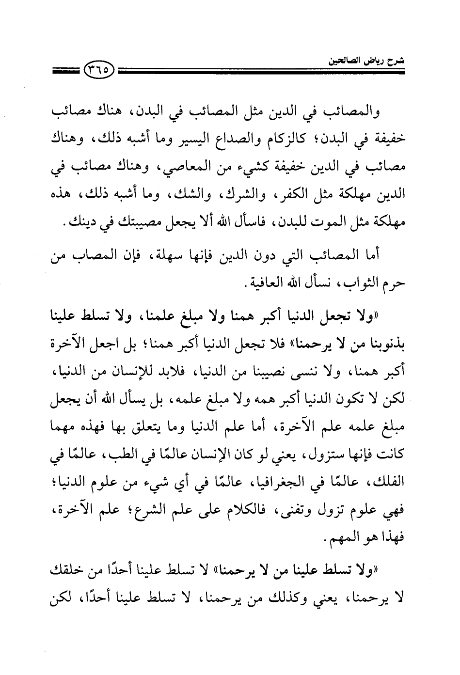 والمصائب في الدين مثل المصائب في البدن هناك مصائب خفيفة في البدن كالزكام والصداع اليسير وما أشبه ذلك وهناك مصائب في الدين خفيفة كشيء من المعاصي وهناك مصائب في الدين مهلكة مثل الكفر والشرك والشك وما أشبه ذلك هذه مهلكة مثل الموت للبدن فأنت تسأل الله ألا يجعل مصيبتك في دينك أما المصائب التي دون الدين فإنها سهلة فإن المصاب من حرم الثواب نسأل الله العافية ولا تجعل الدنيا أكبر همنا ولا مبلغ علمنا ولا تسلط علينا بذنوبنا من لا يرحمنا فلا تجعل الدنيا أكبر همنا بل اجعل الآخرة أكبر همنا ولا ننسى نصيبنا من الدنيا فلابد للإنسان من الدنيا لكن لا تكون الدنيا أكبر همه ولا مبلغ علمه بل يسأل الله أن يجعل مبلغ علمه علم الآخرة أما علم الدنيا وما يتعلق بها فهذه مهما كانت فإنها ستزول يعني لو كان الإنسان عالما في الطب عالما في الفلك عالما في الجغرافيا عالما في أي شيء من علوم الدنيا فهي علوم تزول وتفنى فالكلام على علم الشرع علم الآخرة فهذا هو المهم ولا تسلط علينا من لا يرحمنا لا تسلط علينا أحدا من خلقك لا يرحمنا يعني وكذلك من يرحمنا لا تسلط علينا أحدا لكن