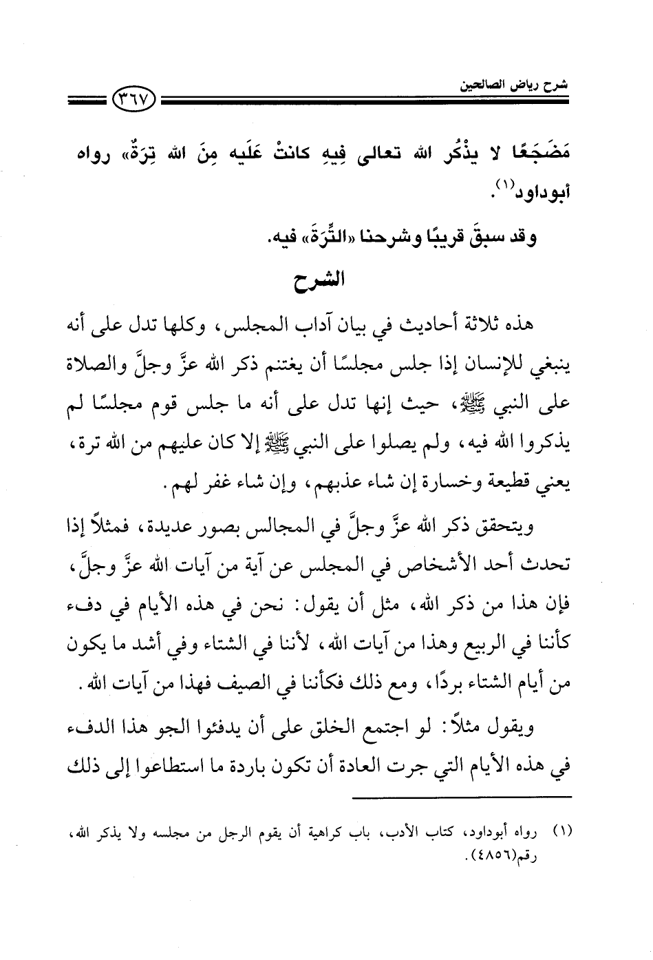 EXهذه ثلاثة أحاديث في بيان آداب المجلس وكلها تدل على أنه ينبغي للإنسان إذا جلس مجلسا أن يغتنم ذكر الله عز وجل والصلاة على النبي صلى الله عليه وعلى آله وسلم حيث إنها تدل على أنه ما جلس قوم مجلسا لم يذكروا الله فيه ولم يصلوا على النبي صلى الله عليه وعلى آله وسلم إلا كان عليهم من الله ترة يعني قطيعة وخسارة إن شاء عذبهم وإن شاء غفر لهم ويتحقق ذكر الله عز وجل في المجالس بصور عديدة فمثلا إذا تحدث أحد الأشخاص في المجلس عن آية من آيات الله عز وجل فإن هذا من ذكر الله مثل أن يقول نحن في هذه الأيام في دفء كأننا في الربع وهذا من آيات الله لأننا في الشتاء وفي أشد ما يكون من أيام الشتاء بردا ومع ذلك فكأننا في الصيف فهذا من آيات الله ويقول مثلا لو اجتمع الخلق على أن يدفئوا هذا الجو في هذه الأيام التي جرت العادة أن تكون باردة ما استطاعوا إلى ذلك