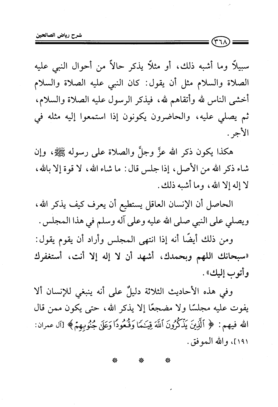 سبيلا وما أشبه ذلك أو مثلا يذكر حالة من أحوال النبي عليه الصلاة والسلام مثل أن يقول كان النبي عليه الصلاة والسلام أخشى الناس لله وأتقاهم لله فيذكر عليه الصلاة والسلام ثم يصلي عليه والحاضرون يكونون إذا استمعوا إليه مثله في الآجر هكذا يكون ذكر الله عز وجل والصلاة على رسول الله صلى الله عليه وسلم وإن شاء الله من الأصل إذا جلس قال: ما شاء الله لا قوة إلا بالله لا إله إلا الله وما أشبه ذلك المهم أن الإنسان العاقل يستطيع أن يعرف كيف يذكر الله ويصلي على النبي صلى الله عليه وعلى آله وسلم في هذا المجلس ومن ذلك أيضا أنه إذا انتهى المجلس وأراد أن يقوم يقول: سبحانك اللهم وبحمدك أشهد أن لا إله إلا أنت أستغفرك وأتوب إليك وفي هذه الأحاديث الثلاثة دليل على أنه ينبغي للإنسان ألا يفوت عليه مجلسا ولا مضطجعا إلا يذكر الله حتى يكون ممن قال الله فيهم: الَّذِينَ يَذْكُرُونَ اللهَ قِيَامًا وَقُعُودًا وَعَلَى جُنُوبِهِمْ