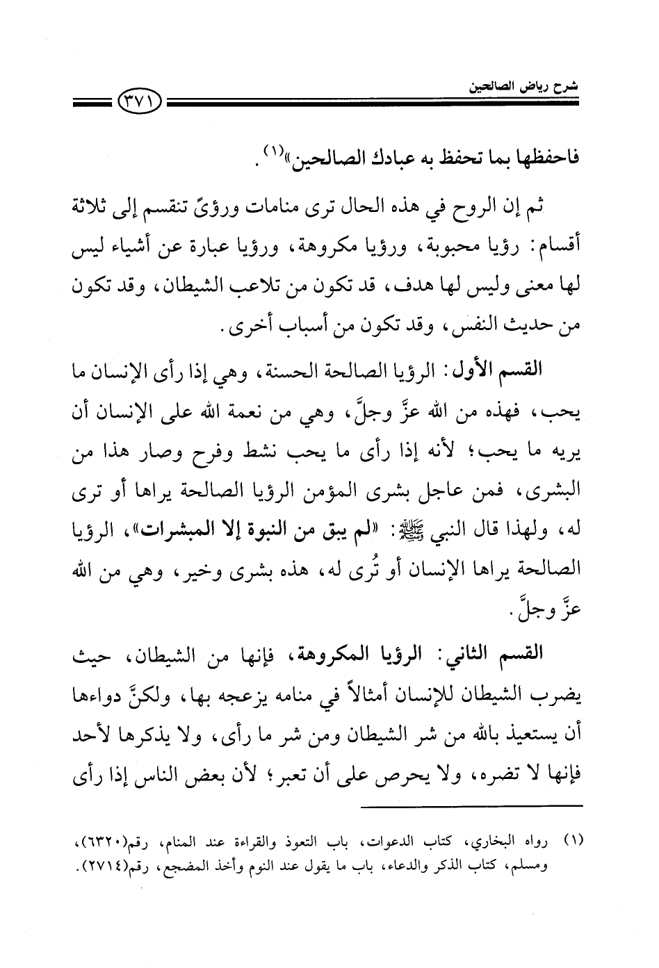 فاحفظها بما تحفظ به عبادك الصالحين ثم إن الروح في هذه الحال ترى منامات ومرائي تنقسم إلى ثلاثة أقسام: رؤيا محبوبة ورؤيا مكروهة ورؤيا عبارة عن أشياء ليس لها معنى وليس لها هدف قد تكون من تلاعب الشيطان وقد تكون من حديث النفس وقد تكون من أسباب أخرى القسم الأول الرؤيا الصالحة الحسنة وهي إذا رأى الإنسان ما يحب فهذه من الله عز وجل وهي نعمة الله على الإنسان أن يريه ما يحب لأنه إذا رأى ما يحب نشط وفرح وصار هذا من البشرى فمن عاجل بشرى المؤمن الرؤيا الصالحة يراها أو ترى له ولهذا قال النبي صلى الله عليه وعلى آله وسلم: لم يبق من النبوة إلا المبشرات الرؤيا الصالحة يراها الإنسان أو ترى له هذه بشرى وخير وهي من الله عز وجل القسم الثاني: الرؤيا المكروهة وهي من الشيطان حيث يضرب الشيطان للإنسان أمثالا في منامه يزعجه بها لمن دواءها أن يستعيذ بالله من شر الشيطان ومن شر ما رأى ولا يذكرها لأحد فإنها لا تضره ولا يحرص على أن تعبر لأن بعض الناس إذا رأى