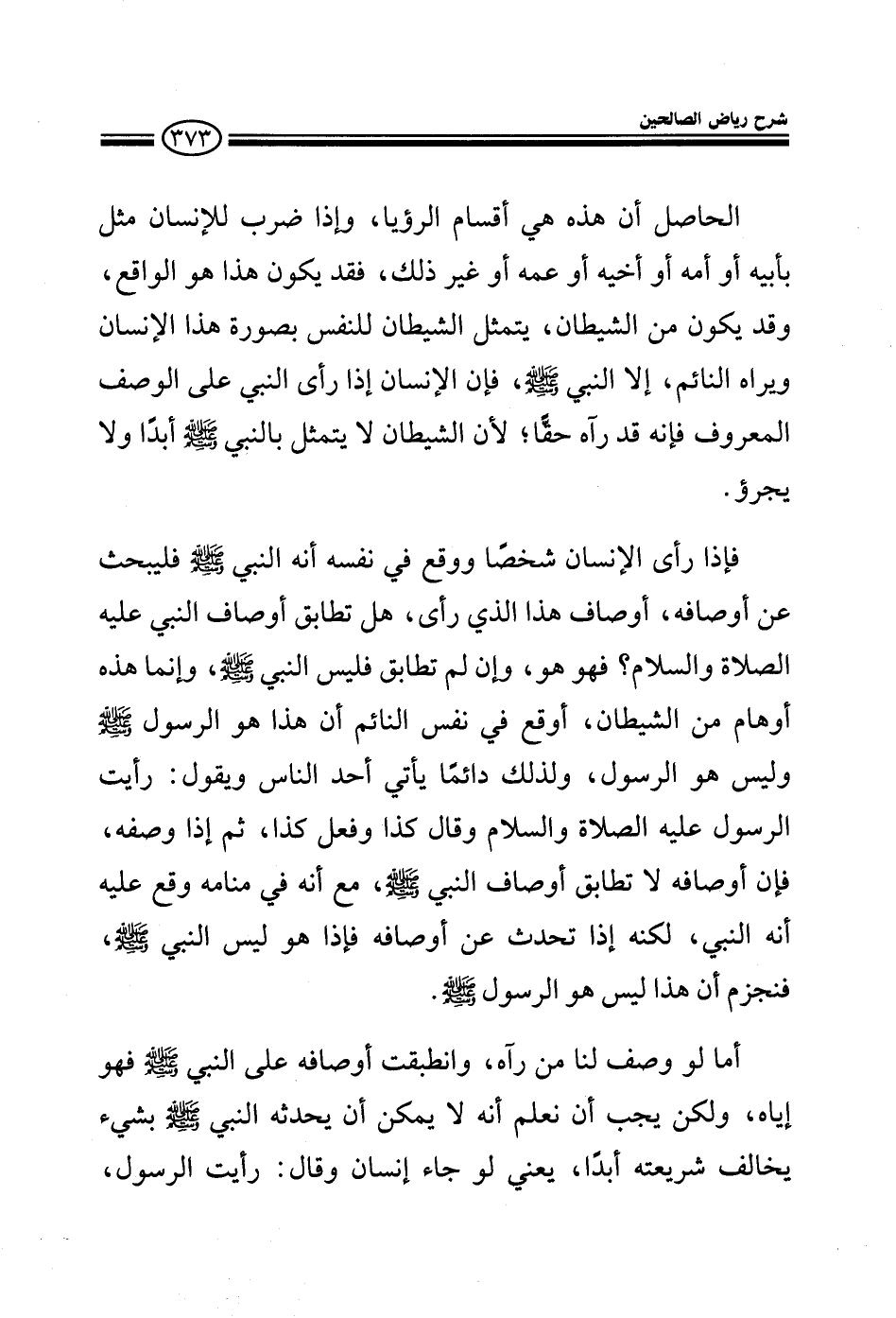 المهم أن هذه هي أقسام الرؤيا وإذا ضرب للإنسان مثل بأبيه أو أمه أو أخيه أو عمه أو غير ذلك فقد يكون هذا هو الواقع وقد يكون من الشيطان يتمثل الشيطان للنفس بصورة هذا الإنسان ويراه النائم إلا النبي صلى الله عليه وعلى آله وسلم فإن الإنسان إذا رأى النبي على هذا الوصف المعروف فإنه قد رآه حقا لأن الشيطان لا يتمثل بالنبي صلى الله عليه وسلم أبدا ولا يجرؤ فإذا رأى الإنسان شخصا ووقع في نفسه أنه النبي صلى الله عليه وسلم فليبحث عن أوصاف هذا الذي رأى هل تطابق أوصاف النبي عليه الصلاة والسلام فهو هو وإن لم تطابق فليس النبي صلى الله عليه وسلم وإنما هذه أوهام من الشيطان أوقع في نفس النائم أن هذا هو الرسول صلى الله عليه وسلم وليس هو الرسول ولذلك دائما يأتي أحد يقول رأيت الرسول عليه الصلاة والسلام وقال كذا وفعل كذا ثم إذا وصفه إذا أوصافه لا تطابق أوصاف النبي صلى الله عليه وسلم مع أنه في منامه وقع عليه أنه النبي لكن إذا تحدث عن أوصافة فإذا هو ليس النبي صلى الله عليه وسلم وصافه فنجزم أن هذا ليس هو الرسول صلى الله عليه وسلم أما لو وصف لنا رآه وانطبقت أوصافه على النبي لله فهو النبي صلى الله عليه وعلى آله وسلم ولكن يجب أن نعمل أنه لا يمكن أن يحدثه النبي صلى الله عليه وسلم بشيء يخالف شريعته يعني لو جاء إنسان وقال رأيت الرسول