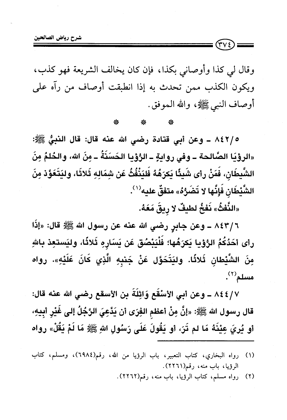 842 - وعن أبي قتادة رضي الله عنه قال: قال النبي صلى الله عليه وسلم: الرؤيا الصالحة وفي رواية الرؤيا الحسنة من الله والحلم من الشيطان فمكن رأى شيئا يكرهه فلينفث عن شماله ثلاثا وليتعوذ من الشيطان فإنها لا تضره متفق عليه النفث نفخ لطيف لا ريق معه