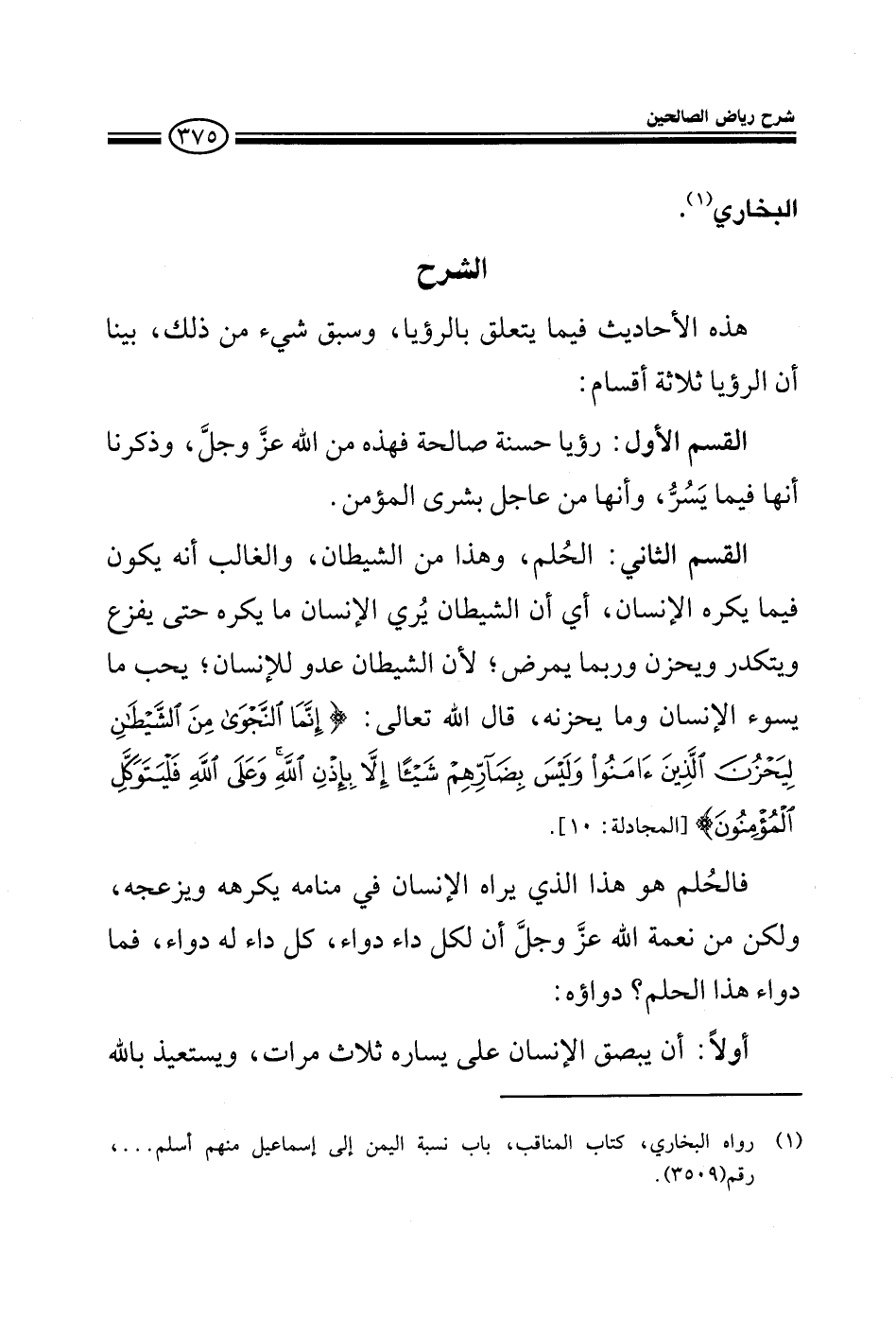 EXهذه الأحاديث فيما يتعلق بالرؤيا وسبق شيء من ذلك وقد بينا أن الرؤيا ثلاثة أقسام: القسم الأول: رؤيا حسنة صالحة فهذه من الله عز وجل وذكرنا فيما يسر وأنها من عاجل بشري المؤمن القسم الثاني: الحلم وهذا من الشيطان والغالب أنه يكون فيما يكره الإنسان أي أن الشيطان يرى الإنسان حتى يفزع ويتكدر ويحزن وربما يمرض لأن الشيطان عدو للإنسان يحب ما يسوء الإنسان وما يحزنه قال الله تعالى إِنَّمَا النَّجْوَى مِنَ الشَّيْطَانِ لِيَحْزُنَ الَّذِينَ آمَنُوا وَلَيْسَ بِضَارِّهِمْ شَيْئًا إِلاَّ بِإِذْنِ اللهِ وَعَلَى اللهِ فَلْيَتَوَكَّلِ الْمُؤْمِنُونَ فالحلم هو هذا الذي يراه الإنسان في منامه يكرهه ويزعجه ولكن من نعمة الله عز وجل وجعل أن جعل لكل داء دواء ودواء الحلم فيما يلي: أولا أن يبصق الإنسان على يساره ثلاث مرات ويستعيذ بالله