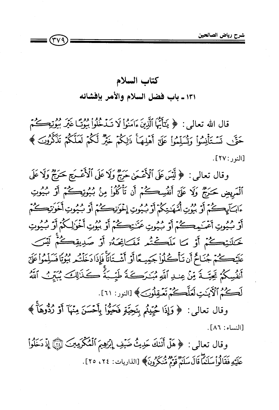 قال الله تعالى: {يا أيها الذين آمنوا لا تدخلوا بيوتا غير بيوتكم حتى تستأنسوا وتسلموا على أهلها} وقال تعالى {فإذا دخلتم بيوتا فسلموا على أنفسكم تحية من عند الله مباركة طيبة} وقال تعالى {وإذا حييتم بتحية فحيوا بأحسن منها أو ردوها} وقال تعالى {هل أتاك حديث ضيف إبراهيم المكرمين إذ دخلوا عليه فقالوا سلاما قال سلام}