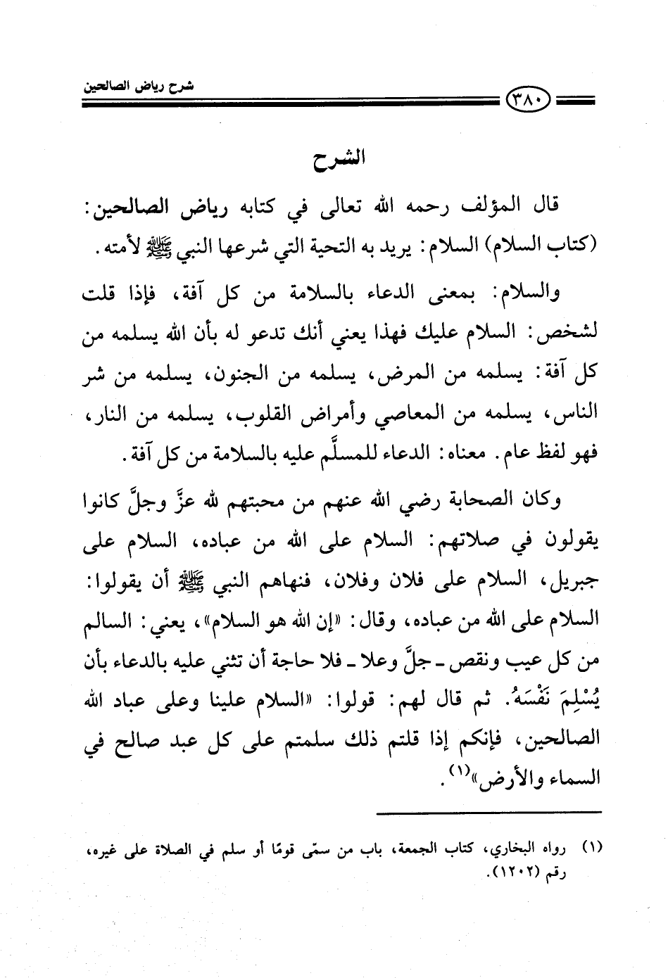 EXقال المؤلف رحمه الله في كتابه رياض الصالحين كتاب السلام والسلام يريد به التحية التي شرعها النبي صلى الله عليه وسلم لأمته والسلام بمعنى الدعاء بالسلامة من كل آفة، فإذا قلت لشخص: السلام عليك فهذا يعني أنك تدعو له بأن الله يسلمه من كل آفة: يسلمه من المرض من الجنون، يسلمه من شر الناس، يسلمه من المعاصي وأمراض القلوب، يسلمه من النار فهو لفظ عام معناه الدعاء للمسلم عليه بالسلامة من كل آفة.