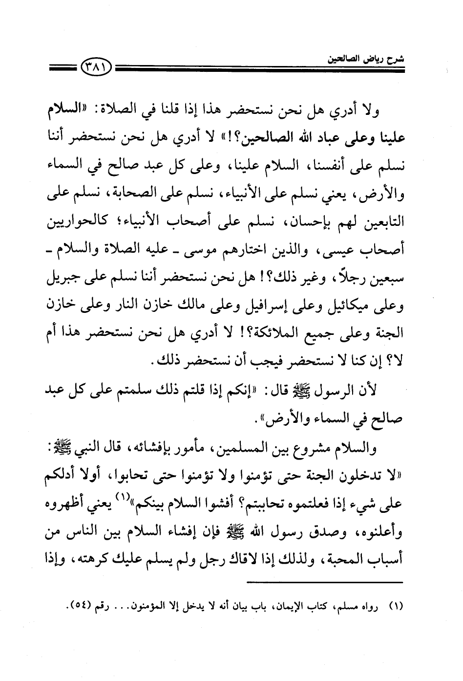ولا أدري هل نحن نستحضر هذا إذا قلنا في الصلاة: السلام علينا وعلى عباد الله الصالحين؟ لا أدري هل نحن نستحضر أننا نسلم على أنفسنا، السلام علينا وعلى كل عبد صالح في السماء والأرض يعني نسلم على الأنبياء نسلم على الصحابة نسلم على التابعين لهم بإحسان، نسلم على أصحاب الأنبياء كالحواريين أصحاب عيسى والذين اختارهم موسى عليه الصلاة والسلام سبعين رجلا وغير ذلك هل نحن نستحضر أننا نسلم على جبريل وعلى ميكائيل وعلى إسرافيل وعلى مالك خازن النار وعلى خازن الجنة وعلى جميع الملائكة لا أدري هل نحن نستحضر هذا أم لا؟ إن كنا لا نستحضر فيجب أن نستحضر ذلك لأن الرسول صلى الله عليه وسلم قال: إنكم إذا قلتم ذلك سلمتم على كل عبد صالح في السماء والأرض.