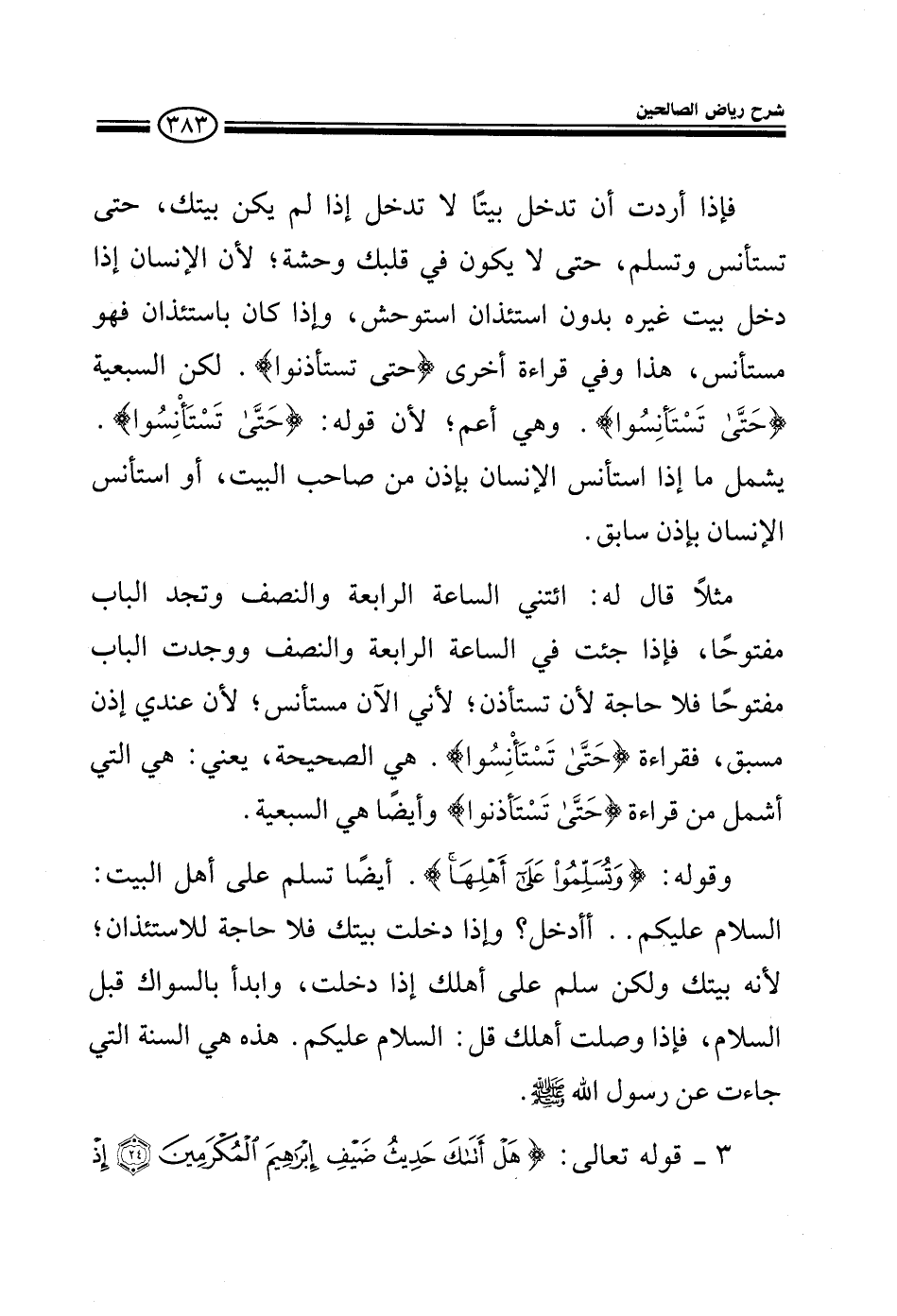 فإذا أردت أن تدخل بيتا لا تدخل إذا لم يكن بيتك حتى تستأنس وتسلم ما معنى الأنس يعني حتى لا يكون في قلبك وحشة لأن الإنسان إذا دخل بيت غيره بدون استئذان استوحش، وإذا دخل باستئذان فهو مستأنس وفي قراءة أخرى تستأذنوا لكن السبعية {حتى تستأنسوا} وهي أعم لأن قوله {تستأنسوا} يشمل ما إذا استأنس الإنسان بإذن من صاحب البيت أو استأنس الإنسان بإذن سابق.