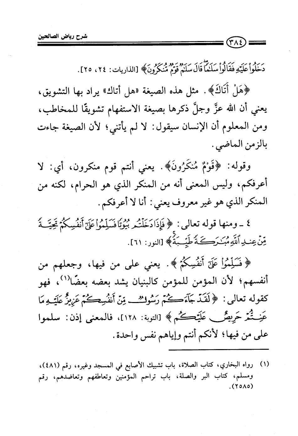 دخلوا عليه فقالوا سلاما قال سلام قوم منكرون} {هل أتاك} مثل هذه الصيغة يراد بها التشويق يعني أن الله عز وجل ذكرها بصيغة الاستفهام تشويقا للمخاطب ومن المعلوم أن الإنسان يقول لم يأتني لأنها ماض وقد سبق الكلام عن هذه الآية أيضا أما قوله {قوم منكرون} يعني أنتم قوم منكرون أيس لا أعرفكم وليس المعنى أنه من المنكر الذي هو الحرام لكنه من المنكر الذي هو غير معروف يعني أنا لا أعرفكم 4 - قوله تعالى {فإذا دخلتم بيوتا فسلموا على أنفسكم تحية من عند الله مباركة طيبة كذلك يبين الله لكم الآيات لعلكم تعقلون} {فسلموا على أنفسكم} يعني على من فيها وجعلهم من أنفسهم لأن المؤمن للمؤمن كالبنيان يشد بعضه بعضا فهو كقوله تعالى {لقد جاءكم رسول من أنفسكم عزيز عليه ما عنتم حريص عليكم} فالمعنى إذن سلموا على من فيها لأنكم أنتم وإياهم نفس واحدة