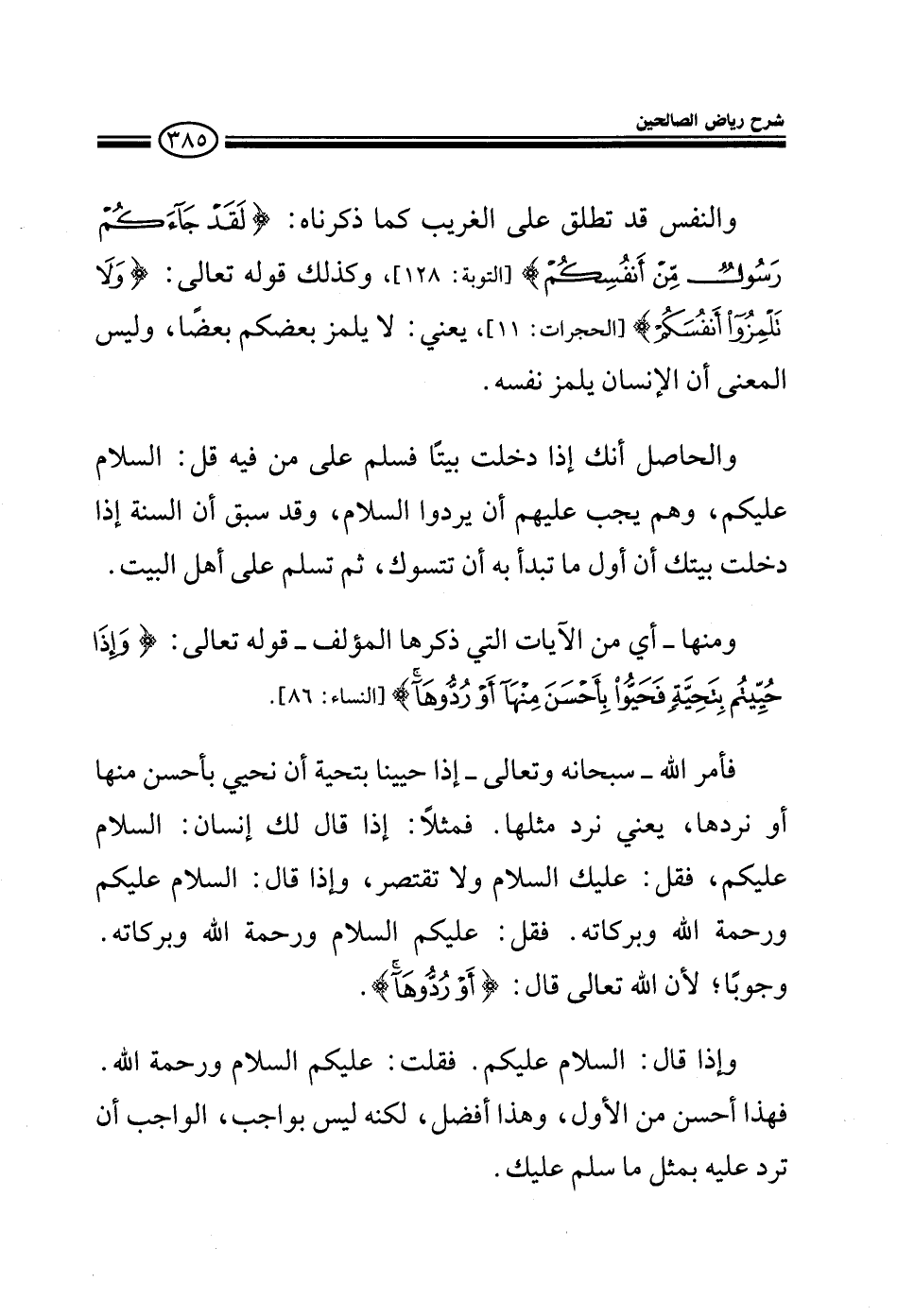 والنفس قد تطلق على الغريب كما ذكرنا {لقد جاءكم رسول من أنفسكم} وكذلك قوله تعالى {ولا تلمزوا أنفسكم} يعني لا يلمز بعضكم بعضا وليس المعنى أن الإنسان يلمز نفسه المهم أنك إذا دخلت بيتا فسلم على من فيه قل: السلام عليكم وهم يجب عليهم أن يردوا السلام وقد سبق أن السنة إذا دخلت بيتك أن أول ما تبدأ به أن تتسوك ثم تسلم على أهل البيت {وإذا حييتم بتحية فحيوا بأحسن منها أو ردوها إن الله كان على كل شيء حسيبا} فأمر الله سبحانه وتعالى إذا حيينا بتحية أن نحيي بأحسن منها أو نردها يعني نرد مثلها فمثلا إذا قال لك إنسان (السلام عليك) فقل (عليك السلام) ولا تنقص وإذا قال (السلام عليك ورحمة الله) فقل (عليك السلام ورحمة الله) وإذا قال (السلام عليك ورحمة الله وبركاته) فقل (عليك السلام ورحمة الله وبركاته) وجوبا لأن الله قال {أو ردوها} وإذا قال (السلام عليك) فقلت (وعليك السلام ورحمة الله) فهذا أحسن من الأول وأفضل لكنه ليس بواجب الواجب أن ترد عليه بمثل ما سلم عليك