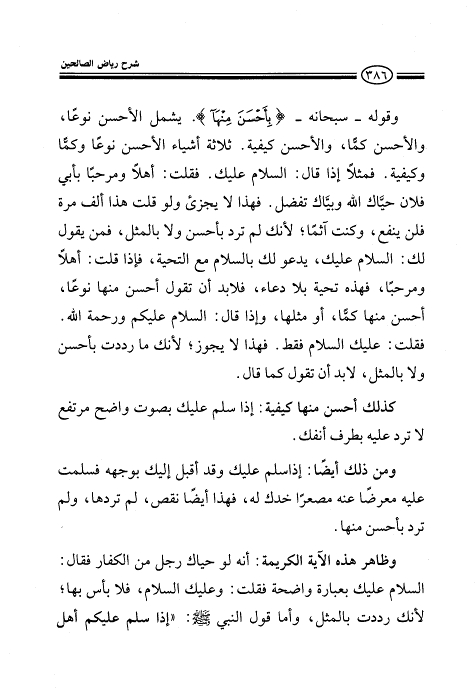 وقوله سبحانه {بأحسن منها} يشمل الأحسن نوعا والأحسن كما والأحسن كيفية فمثلا إذا قال السلام عليك فقلت أهلا ومرحبا بأبي فلان حياك الله وبياك تفضل فهذا لا يجزئ ولو قلته ألف مرة لن ينفع وكنت آثما لأنك لم ترد بأحسن ولا بالمثل فهو عندما قال السلام عليك يدعو لك بالسلام مع التحية فإذا قلت أهلا ومرحبا فهذه تحية بلا دعاء فلابد أن تقول أحسن منها نوعا أحسن منها كما أو مثلها وإذا قال: السلام عليك ورحمة الله فقلت عليك السلام فهذا لا يجوز لأنك ما رددت بأحسن ولا بالمثل لابد أن تقول كما قال كذلك أحسن منها كيفية فإذا سلم عليك بصوت واضح مرتفع لا ترد عليه بطرف أنفك ومن ذلك أيضا: إذا سلم عليك وقد أقبل إليك بوجهه فسلمت عليه معرضا عنه مصعرا خدك له فهذا أيضا نقص لم تردها ولم ترد بأحسن منها وظاهر هذه الآية الكريمة أنه لو حياك رجل من الكفار قال السلام عليك بعبارة واضحة فقلت وعليك السلام فلا بأس بها لأنك رددت بالمثل وأما قول النبي صلى الله عليه وسلم إذا سلم عليكم أهل الكتاب