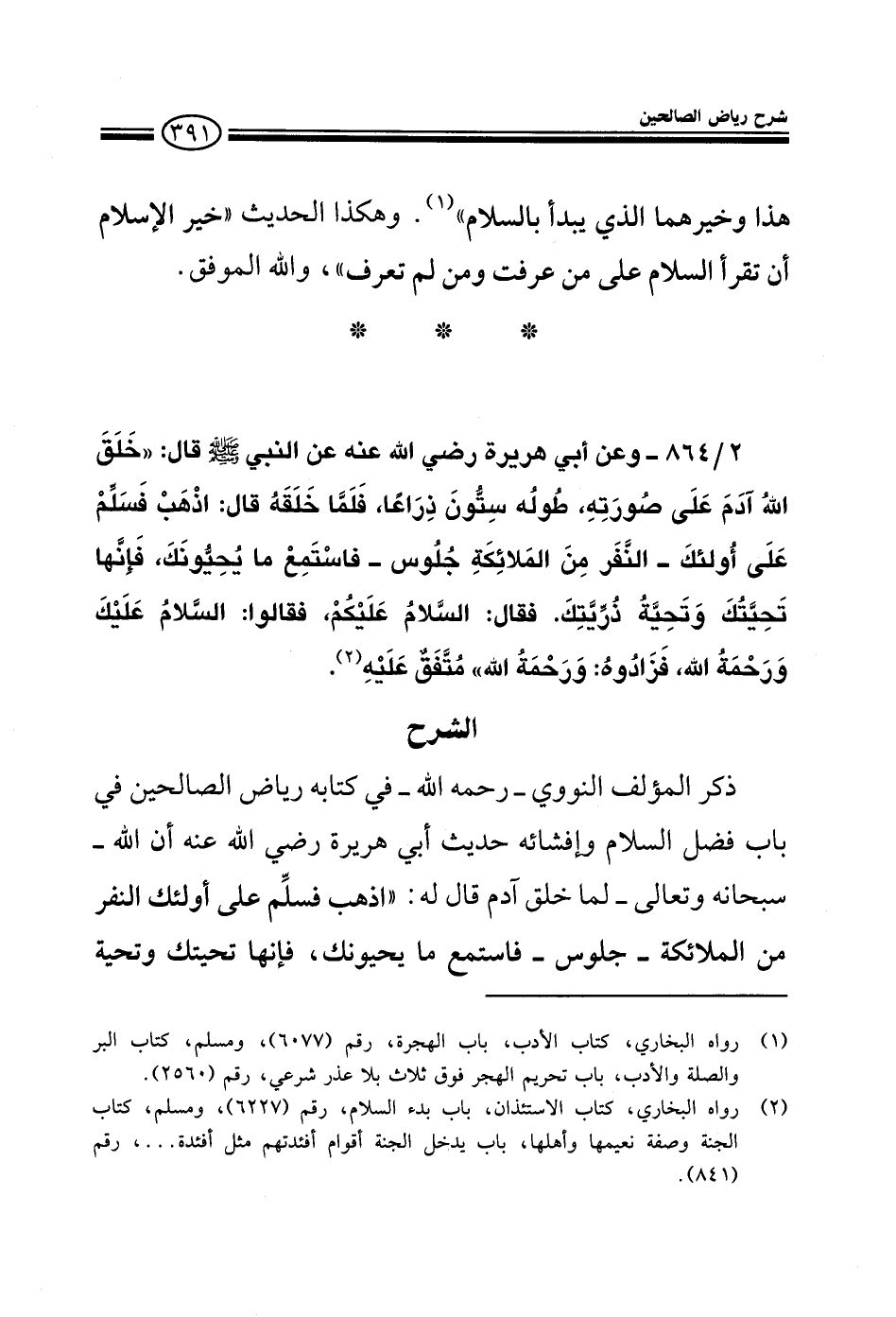 EXذكر المؤلف رحمه الله في كتابه رياض الصالحين في باب فضل السلام والأمر بإفشائه عن أبي هريرة رضي الله عنه أن الله لما خلق آدم قال له: اذهب إلى هؤلاء النفر من الملائكة وهم جلوس فسلم عليهم وانظر ماذا يحيونك به فإنها تحيتك وتحية
