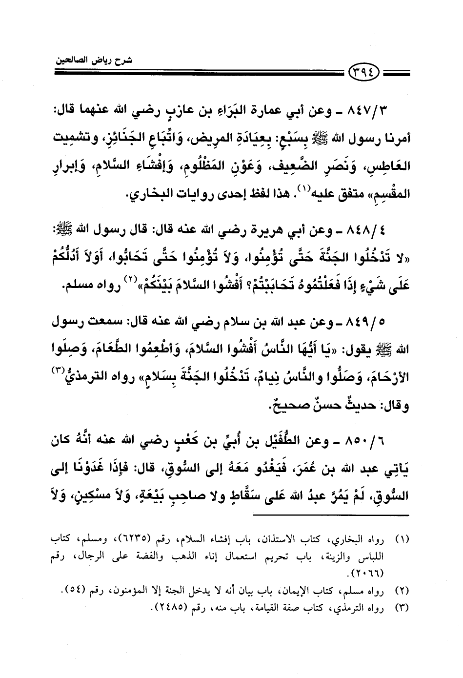 847 - وعن أبي عمارة البراء بن عازب رضي الله عنهما قال أمرنا رسول الله صلى الله عليه وسلم بسبع بعيادة المريض واتباع الجنائز وتشميت العاطس ونصر الضعيف وعون المظلوم وإفشاء السلام وإبرار المقسم متفق عليه هذا لفظ إحدي روايات البخاري