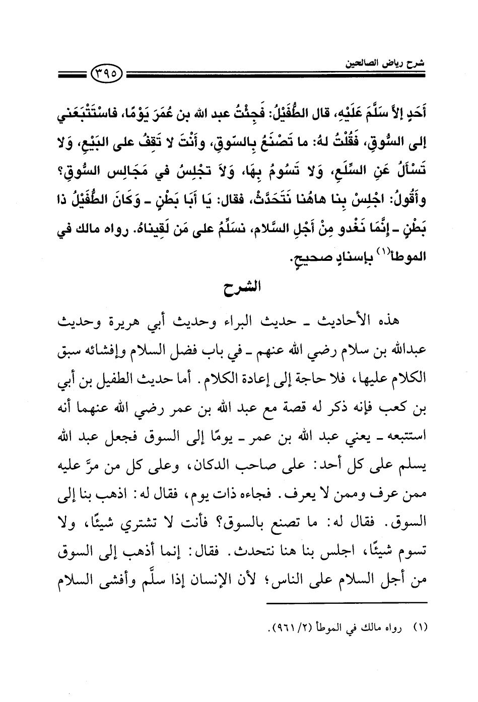 EXهذه الأحاديث في باب فضل السلام وإفشائه سبق الكلام عليها حديث البراء وأبي هريرة وعبد الله بن سلام كلها سبق الكلام عليها فلا حاجة إلى إعادة الكلام أما حديث الطفيل بن أبي بن كعب فإنه ذكر له قصة مع عبد الله بن عمر رضي الله عنه أنه استتبعه يعني عبد الله بن عمر يوما إلى السوق فجعل عبد الله بن عمر يسلم على كل أحد على صاحب الدكان وعلى كل من مر به ممن عرف وممن لا يعرف فجاءه ذات يوم فقال له: اذهب بنا إلى السوق فقال له ماذا تصنع في السوق فأنت لا تشتري شيئا ولا تبيع شيئا اجلس بنا نتحدث فقال إنما أذهب إلى السوق من أجل السلام على الناس لأن الإنسان إذا سلم وأفشى السلام