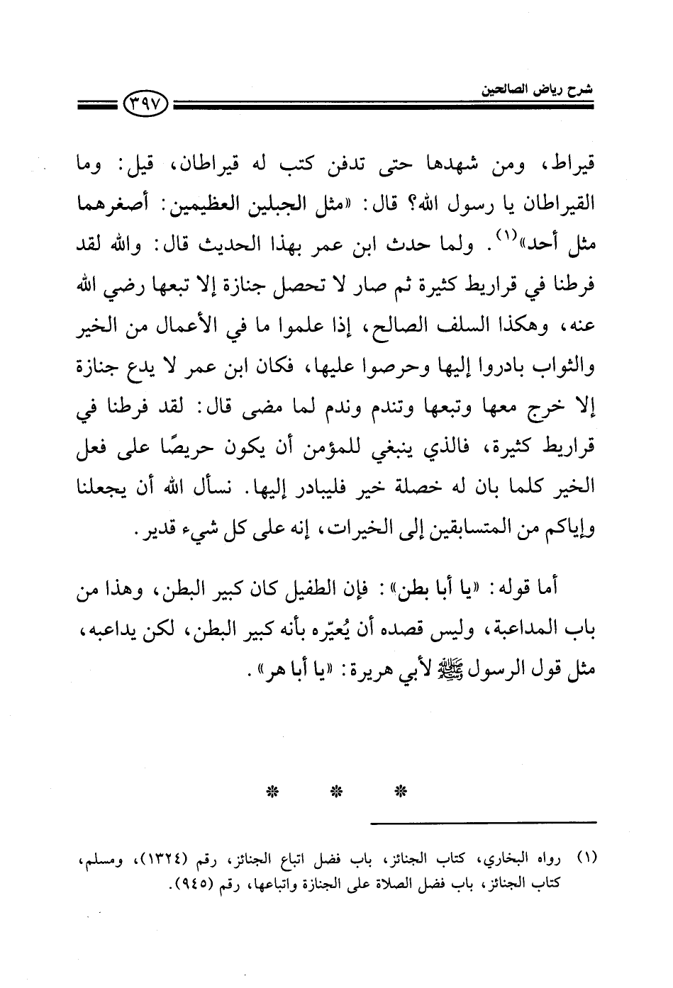 قيراط ومن شهدها حتى تدفن كتب له قيراطان قيل وما القيراطان يا رسول الله قال مثل الجبلين العظيمين أصغرهما مثل أحد ولما حدث ابن عمر بهذا الحديث قال والله لقد فرطنا في قراريط كثرة ثم صار لا تحصل جنازة إلا تبعها رضي الله عنه وهكذا السلف الصالح إذا علموا ما في الأعمال من الخير والثواب بادروا إليها وحرصوا عليها فالذي ينبغي للمؤمن أن يكون حريصا على فعل الخير كلما بأن له خصلة خير فليبادر إليها نسأل الله أن يجعلنا وإياكم من المتسابقين إلى الخيرات إنه على كل شيء قدير أما قوله يا أبا بطن فإن الطفيل كان كبير البطن وهذا من باب المداعبة وليس قصده أن يعيره بأنه كبير البطن لكن يداعبه مثل قول الرسول لأبي هريرة يا أبا هر