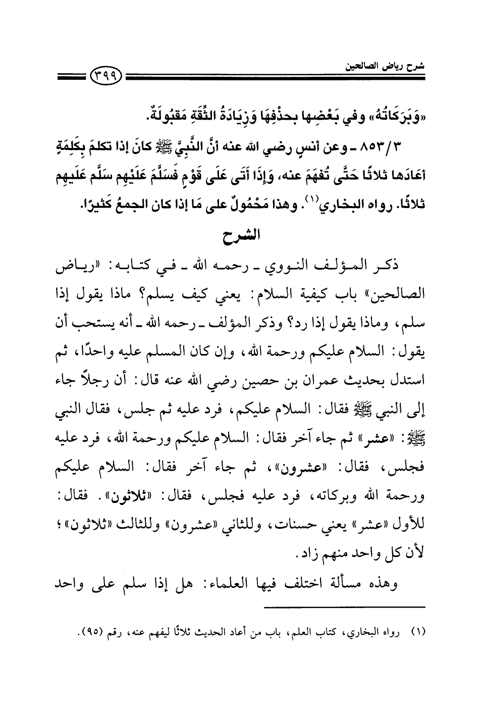 853 - وعن أنس رضي الله عنه أن النبي صلى الله عليه وسلم كان إذا تكلم بكلمة أعادها ثلاثا حتى تفهم عنه وإذا أتى على قوم فسلم عليهم سلم عليهم ثلاثا رواه البخاري وهذا محمول على ما إذا كان الجمع كثيرا
