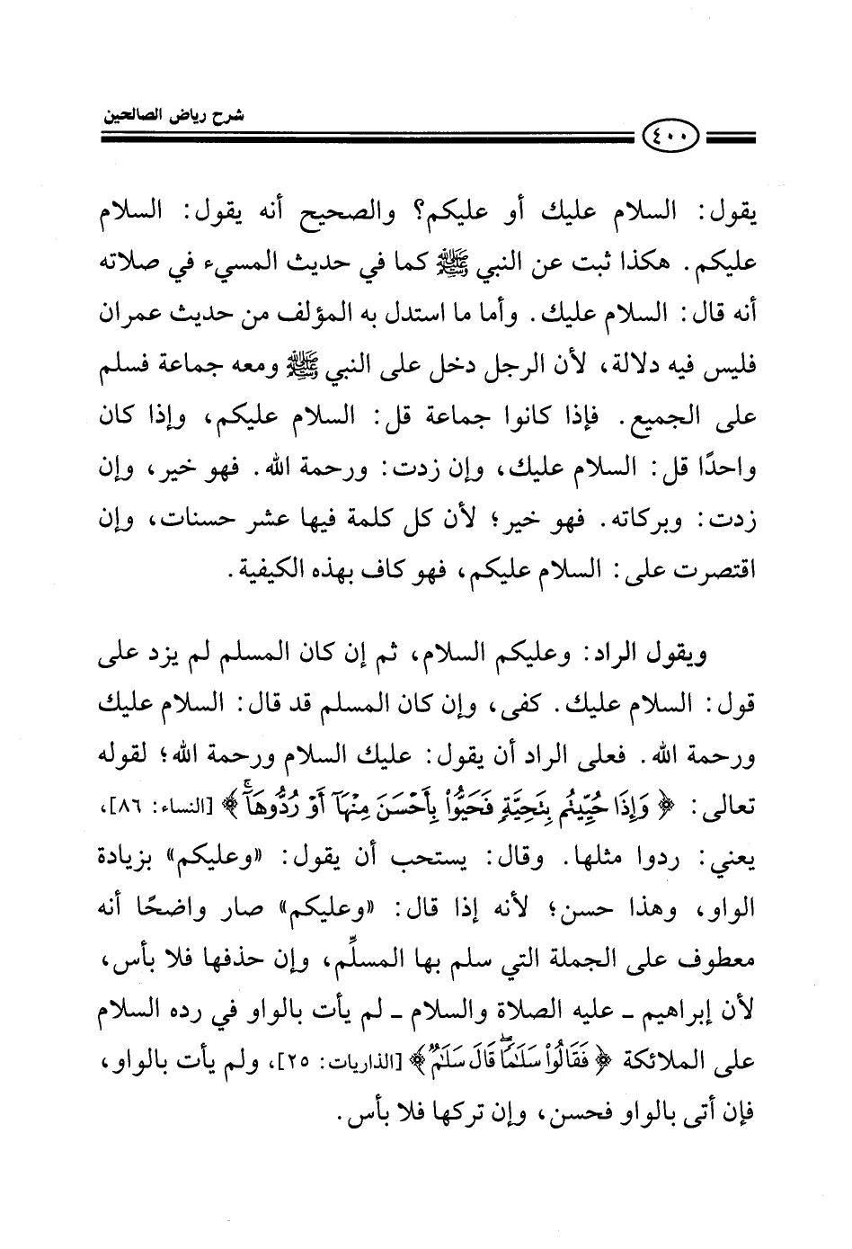 يقول السلام عليك أم عليكم؟ والصحيح أن يقول السلام عليك هكذا ثبت عن النبي صلى الله عليه وسلم كما في حديث المسيء في صلاته أنه قال السلام عليك وأما ما استدل به المؤلف من حديث عمران فليس فيه دلالة لأن الرجل دخل مع النبي صلى الله عليه وسلم ومعه جماعة فسلم على الجميع فإذا كانوا جماعة فقل السلام عليكم وإذا كان واحدا فقل السلام عليك وإن زدت ورحمة الله فهو خير وإن زدت وبركاته فهو خير لأن كل كلمة فيها عشر حسنات وإن اقتصرت على السلام عليك فهو كاف ويقول الراد وعليكم السلام ثم إن كان المسلم لم يزد على قول السلام عليك كفي وإن كان المسلم قد قال السلام عليك ورحمة الله فعلى الراد أن يقول السلام عليك ورحمة الله لقوله تعالى وإذا حييتم بتحية فحيوا بأحسن منها أو ردوها يعني ردوا مثلها وقال يستحب أن يقول وعليكم بزيادة الواو وهذا حسن لأنه إذا قال وعليكم صار واضحا أنه معطوف على الجملة التي سلم بها المسلم وإن حذفها فلا بأس لأن إبراهيم عليه السلام لم يأت بالواو في رده السلام على الملائكة {فقالوا سلاما قال سلام} ولم يأت بالواو فإن أتى بالواو فحسن وإن تركها فلا بأس