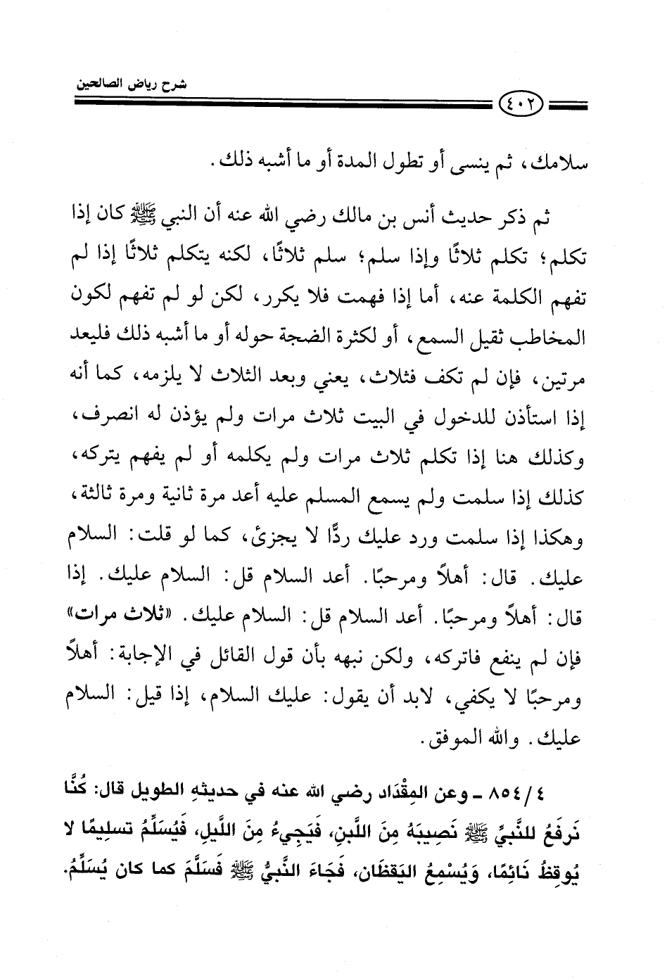 854 - وعن المقداد رضي الله عنه في حديثه الطويل قل كنا نرفع للنبي صلى الله عليه وسلم نصيبه من اللبن فيجيء من الليل فيسلم تسليما لا يوقظ نائما ويسمع اليقظان فجاء النبي صلى الله عليه وسلم فسلم كما كان يسلم