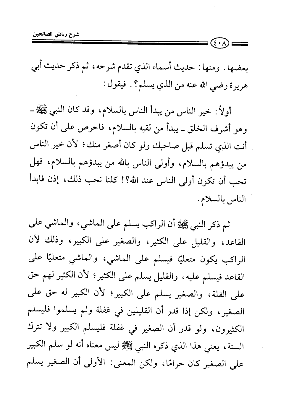 بعضها ثم ذكر حديث أبي هريرة رضي الله عنه من الذي يسلم فنقول أولا: خير الناس من يبدأ الناس بالسلام وقد كان النبي صلى الله عليه وسلم وهو أشرف الخلق يبدأ من لقيه بالسلام فاحرص على أن تكون أنت الذي تسلم قبل صاحبك ولو كان أصغر منك لأن خير الناس من يبدؤهم بالسلام وأولى الناس بالله من يبدؤهم بالسلام فهل تحب أن تكون أولى الناس عند الله كلنا يحب ذلك إذن فابدأ الناس بالسلام ثم ذكر النبي صلى الله عليه وسلم أن الراكب يسلم على الماشي والماشي على القاعد والقليل على الكثير والصغير على الكبير وذلك لأن الراكب يكون متعلقا فيسلم على الماشي والماشي متعليا على القاعد فيسلم عليه والقليل يسلم على الكثير لأن الكثير لهم حق على القليل والصغير يسلم على الكبير لأن الكبير له حق على الصغير ولكن لو قدر أن القليلين في غفلة ولم يسلموا فليسلم الكثيرون ولو قدر أن الصغير في غفلة فليسلم الكبير ولا تترك السنة وهذا الذي ذكره النبي صلى الله عليه وسلم ليس معناه أنه لو سلم الكبير على الصغير كان حراما ولكن المعنى الأولى أن الصغير يسلم