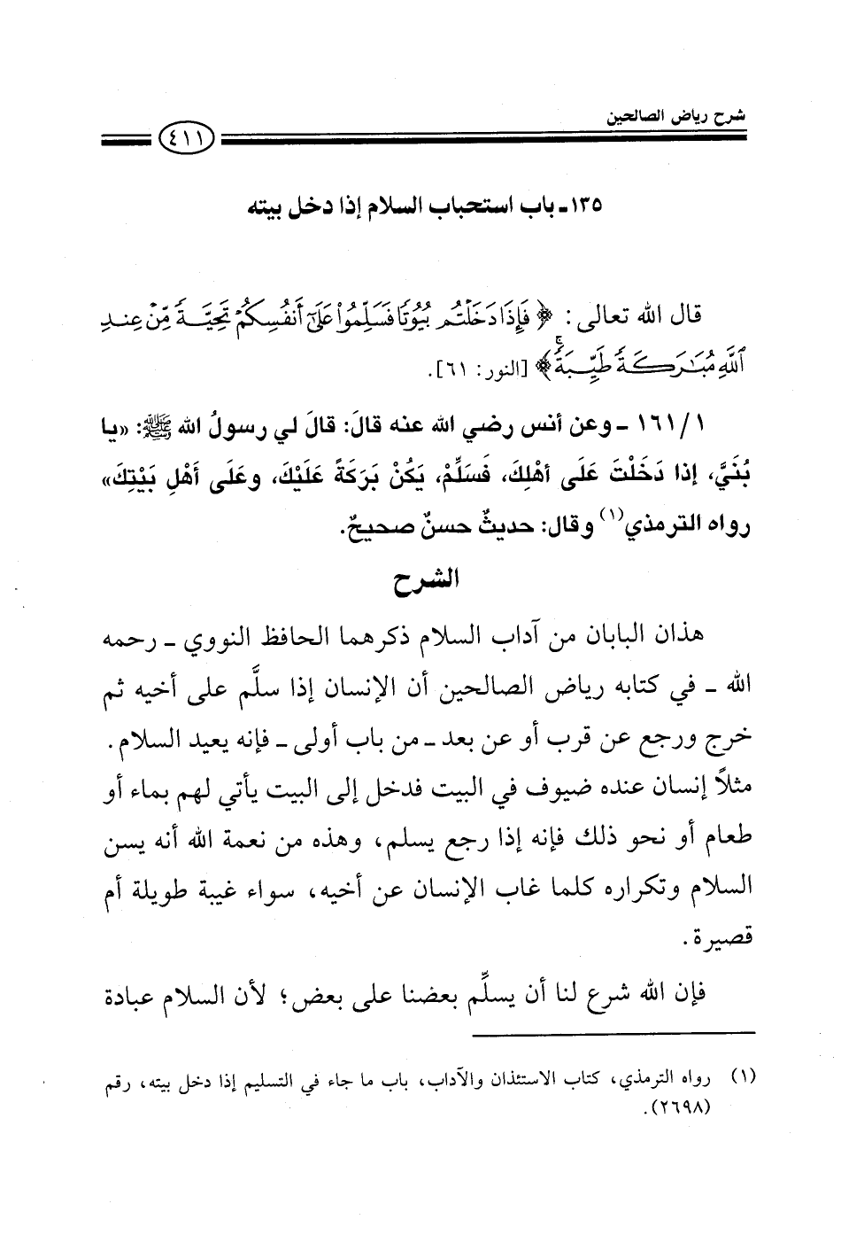 EXهذان البابان من آداب السلام ذكرهما النووي رحمه الله في كتابه رياض الصالحين أن الإنسان إذا سلم على أخيه ثم خرج ورجع عن قرب أو عن بعد من باب أولى فإنه يعيد السلام مثلا إنسان عنده ضيوف في البيت فدخل إلى البيت يأتي لهم بماء أو طعام أو نحو ذلك فإنه إذا رجع يسلم وهذه من نعمة الله أنه يسن السلام وتكراره كلما غاب الإنسان عن أخيه سواء غيبة طويلة أو قصيرة فإن الله شرع لنا أن يسلم بعضنا على بعض لأن السلام عبادة
