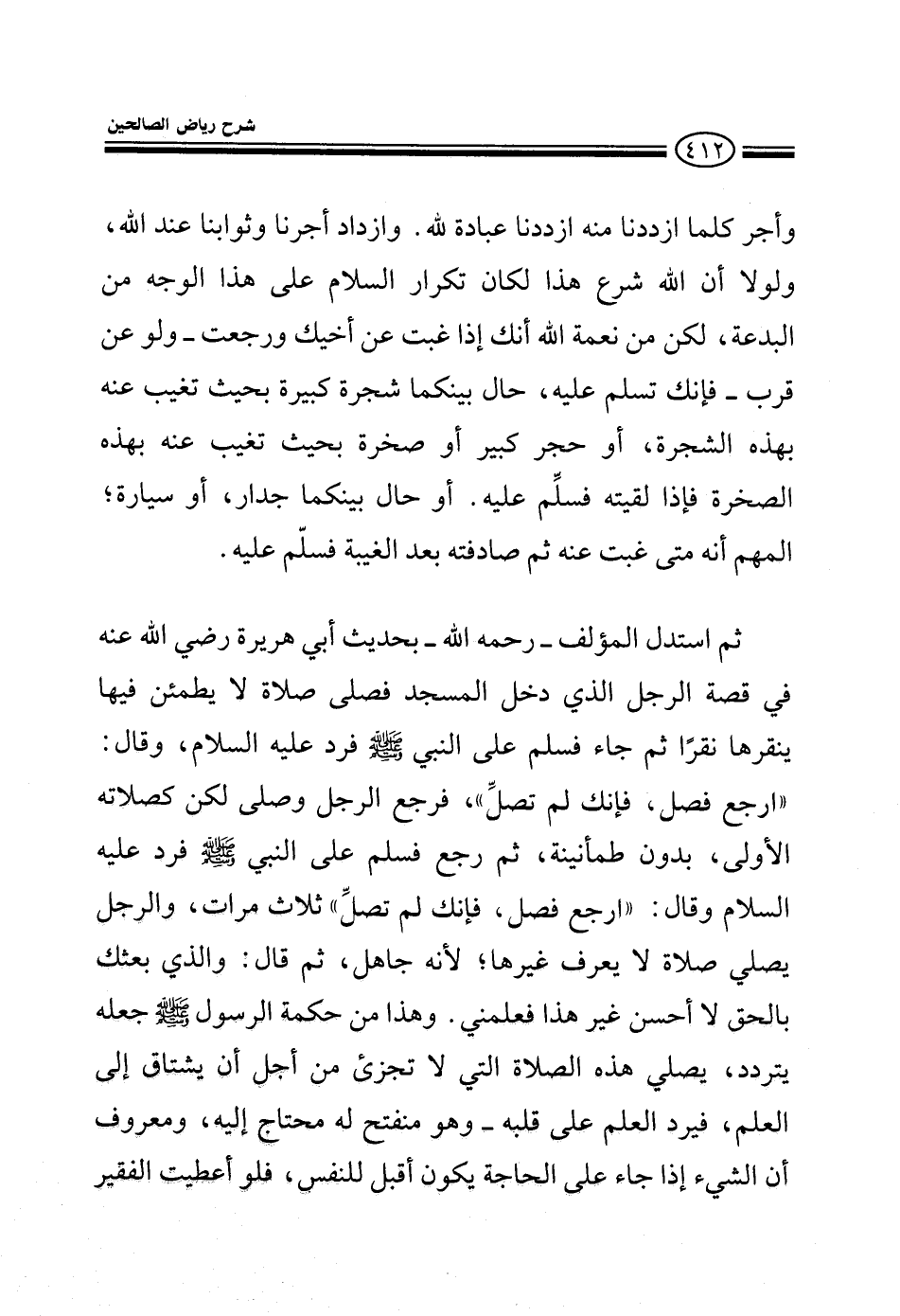 وأجر كلما ازددنا منه ازددنا عبادة لله وازداد أجرنا وثوابنا عند الله ولولا أن الله شرع هذا لكان تكرار السلام على هذا الوجه من البدعة لكن من نعمة الله أنك إذا غبت عن أخيك ورجعت ولو عن قرب فإنك تسلم عليه حال بينكما شجرة أو حجر كبير بحيث تغيب عنه فإذا لقيته فسلم عليه ثم استدل المعلق رحمه الله بحديث أبي هريرة رضي الله عنه في قصة الرجل الذي دخل المسجد فصلى صلاة لا يطمئن فيها ينقرها نقرا ثم جاء فسلم على النبي صلى الله عليه وسلم فرد عليه السلام وقال ارجع فصل فإنك لم تصل فرجع الرجل وصلى لكن كصلاته الأولى بدون طمأنينة ثم رجع فسلم على النبي صلى الله عليه وسلم فرد عليه السلام وقال ارجع فصل فإنك لم تصل ثلاث مرات والرجل يصلي صلاة لا يعرف غيرها لأنه جاهل ثم قال والذي بعثك بالحق لا أحسن غير هذا فعلمني وهذا من حكمة الرسول صلى الله عليه وسلم جعله يتردد يصلي هذه الصلاة التي لا تجزئ من أجل أن يشتاق إلى العلم ويتشوف إليه فيرد العلم على قلبه وهو منفتح له محتاج إليه ومعروف أن الشيء إذا جاء على الحاجة يكون أقبل للنفس انظر الآن تعطي الفقير