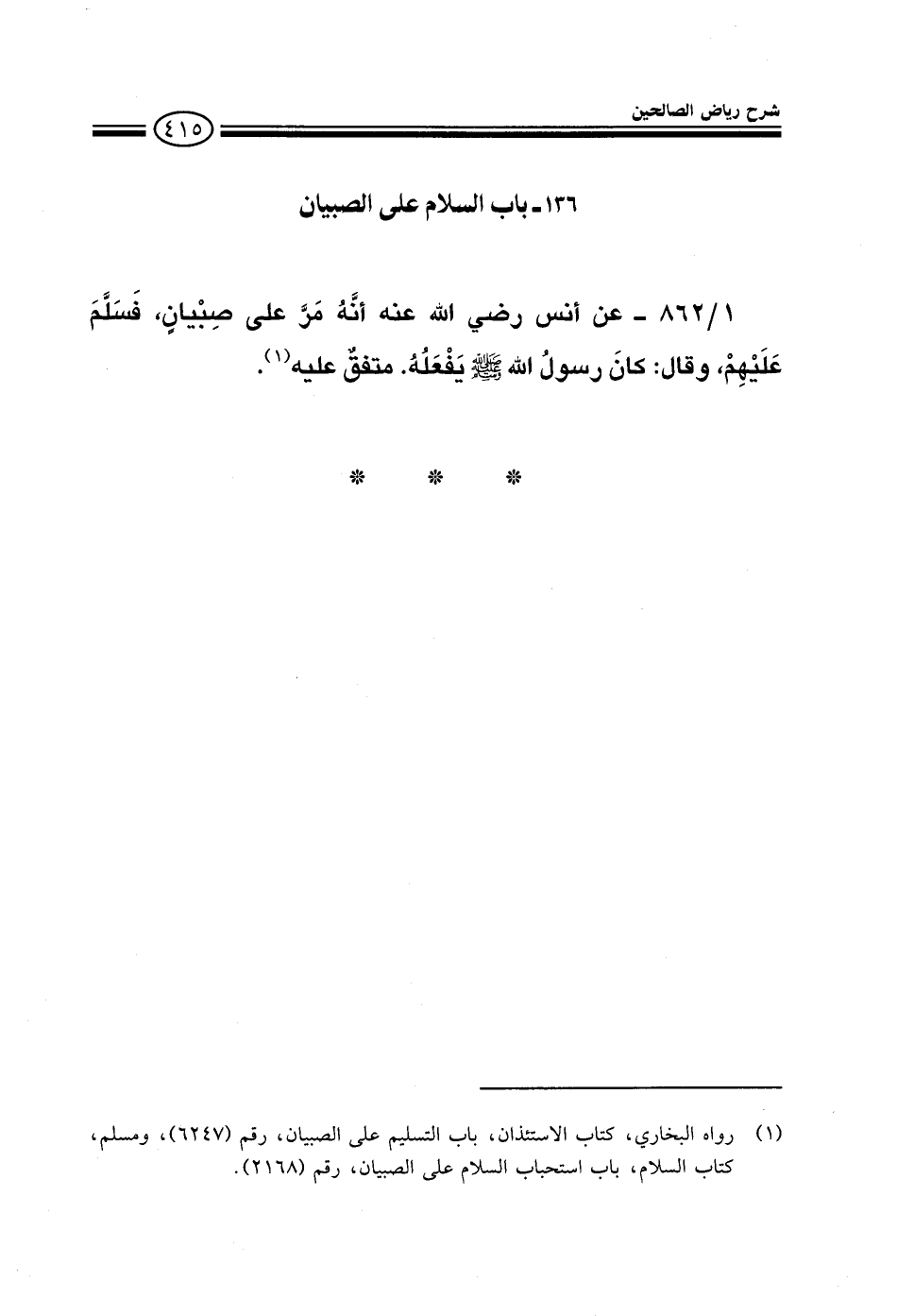 862 - عن أنس رضي الله عنه أنه مر على صبيان فسلم عليهم وقال: كان رسول الله صلى الله عليه وسلم يفعله متفق عليه