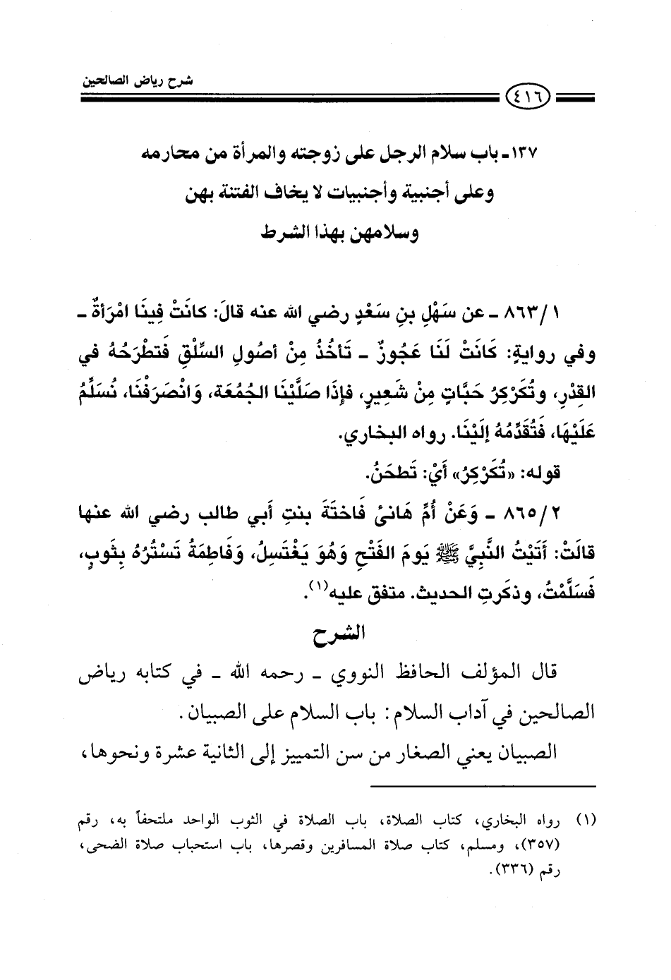 باب سلام الرجل على زوجته والمرأة من محارمه وعلى أجنبية وأجنبيات لا يخاف الفتنة بهن وسلامهن بهذا الشرط