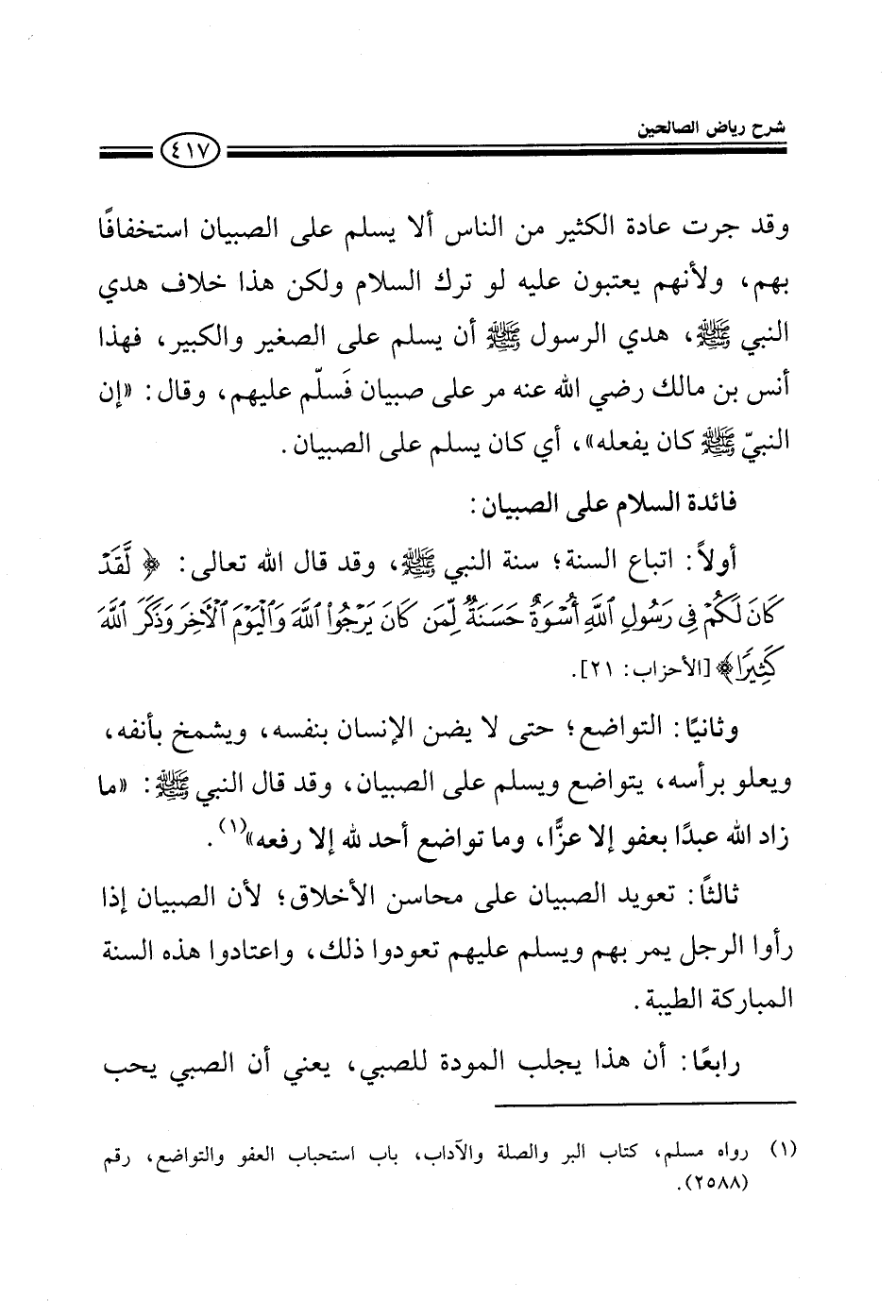 وقد جرت عادة الكثير من الناس ألا يسلم على الصبيان استخفافا بهم ولكن هذا خلاف هدي النبي صلى الله عليه وسلم حيث كان يسلم على الصغير والكبير فهذا أنس بن مالك رضي الله عنه مر على صبيان فسلم عليهم وقال إن النبي صلى الله عليه وسلم كان يفعله أي كان يسلم على الصبيان وللسلام على الصبيان أكثر من فائدة 1 - اتباع السنة: سنة النبي صلى الله عليه وسلم وقد قال الله تعالى لقد كان لكم في رسول الله أسوة حسنة لمن كان يرجو الله واليوم الآخر 2 - التواضع: حتى لا يذم الإنسان بنفسه ويشمخ بأنفه ويعلو برأسه يتواضع ويسلم على الصبيان وقد قال النبي صلى الله عليه وسلم ما زاد الله عبدا بعفو إلا عزا وما تواضع أحد لله إلا رفعه 3 - تعويد الصبيان لمحاسن الأخلاق لأن الصبيان إذا رأوا الرجل يمر بهم ويسلم عليهم تعودوا ذلك واعتادوا هذه السنة المباركة الطيبة 4 - أن هذا يجلب المودة للصبي يعني أن الصبي يحب