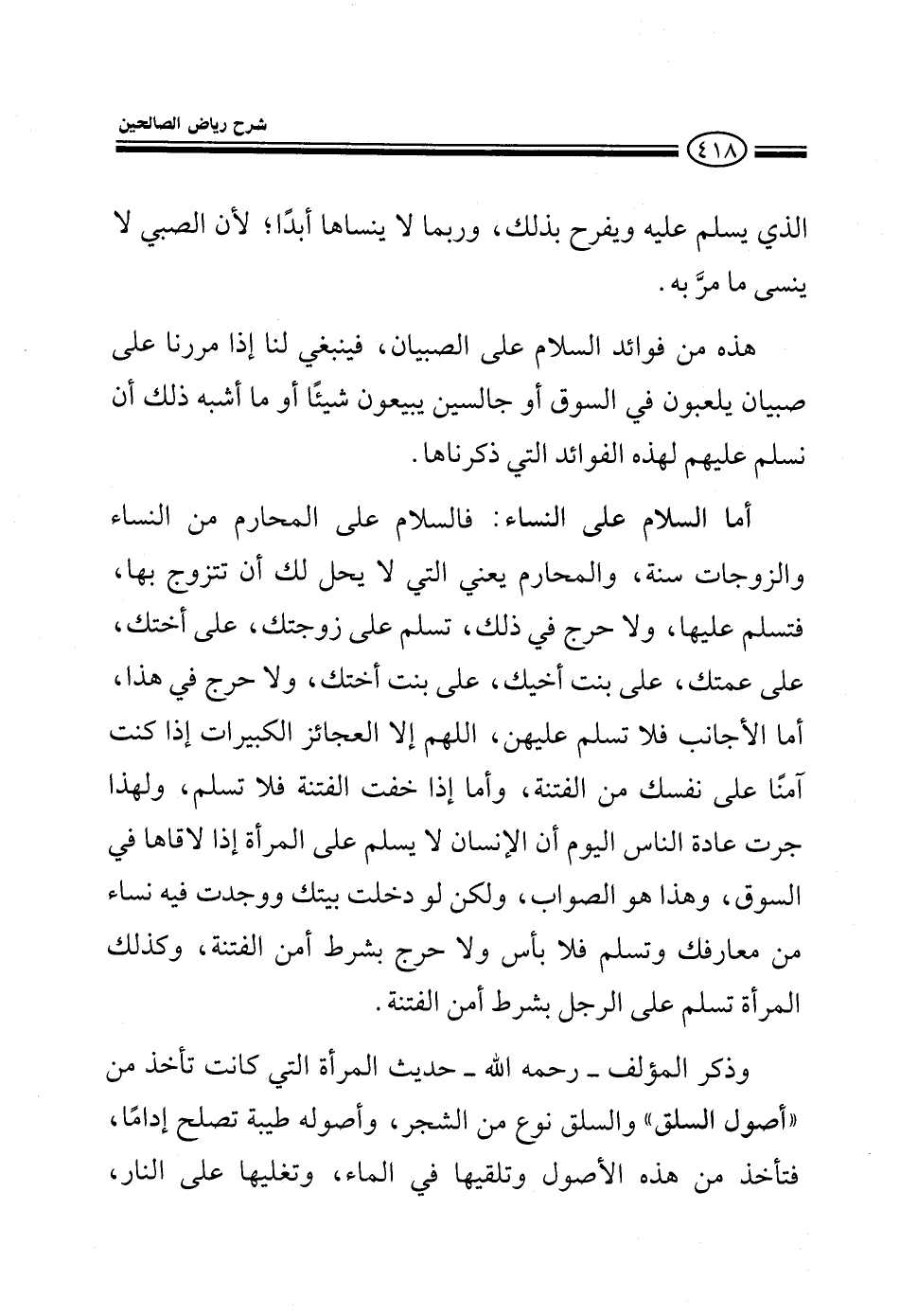الذي يسلم عليه ويفرح لذلك وربما لا ينساها أبدا لأن الصبي لا ينسى ما مر به فهذه من فوائد السلام على الصبيان فينبغي لنا إذا مررنا على صبيان يلعبون في السوق أو جالسين يبيعون شيئا أو ما أشبه ذلك أن نسلم عليهم لهذه الفوائد التي ذكرناها أما السلام على النساء فالسلام على المحارم من النساء والزوجات سنة والمحارم يعني التي لا يحل لك أن تتزوج بها تسلم عليها ولا حرج في ذلك تسلم على زوجتك أختك عمتك بنت أخيك بنت أختك ولا حرج في هذا أما الأجانب فلا تسلم عليهن اللهم إلا العجائز الكبيرات إذا كنت آمنا على نفسك من الفتنة وأما إذا خفت الفتنة فلا تسلم ولهذا جرت عادة الناس اليوم أن الإنسان لا يسلم على المرأة إذا لاقاها في السوق وهذا هو الصواب ولكن لو أتيت بيتك ووجدت فيه نساء من معارفك وسلمت فلا بأس ولا حرج بشرط أمن الفتنة وكذلك المرأة تسلم على الرجل بشرط أمن الفتنة وذكر المؤلف رحمه الله حديث المرأة التي كانت تأخذ من أصول السلق وهو نوع من الشجر وأصوله طيبة تصلح إداما فتأخذ من هذه الأصول وتلقيها في الماء وتغليها على النار