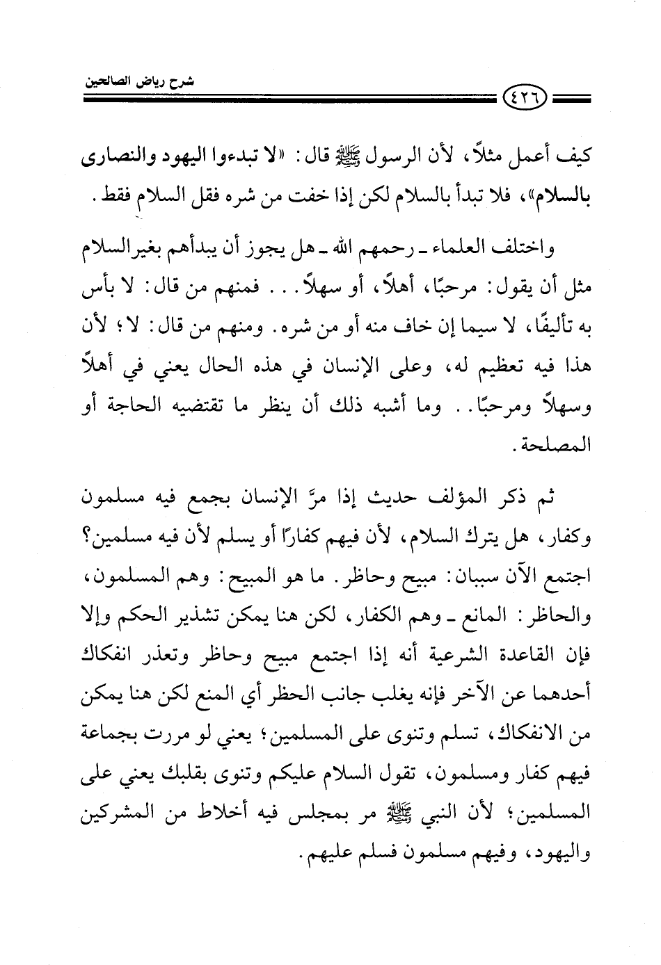 فمنهم من قال لا بأس به تأليفا لاسيما إن خاف منه أو لم يأمن شره ومنهم من قال لا لأن ذلك فيه تعظيم له والإنسان في هذه الحال مرحبا أهلا وما أشبه ذلك ينظر ما تقتضيه الحاجة أو المصلحة ثم ذكر المؤلف حديث إذا مر الإنسان بجمع فيه مسلمون وكفار هل يترك السلام لأن فيهم كفارا أم يسلم لأن فيه مسلمين اجتمع الآن سببان مبيح وحاظر المبيح وهم المسلمون والحاظر المانع وهم الكفار لكن هنا يمكن تشذير الحكم وإلا فالقاعدة الشرعية أنه إذا اجتمع مبيح وحاظر وتعذر انفكاك أحدهما عن الآخر فإنه يغلب جانب الحاظر أي المنع لكن هنا يمكن من الانفكاك تسلم وتنوي على المسلمين لأن النبي صلى الله عليه وسلم مر بمجلس فيه أخلاط من المشركين واليهود وفيهم مسلمون فسلم عليهم والله الموفق