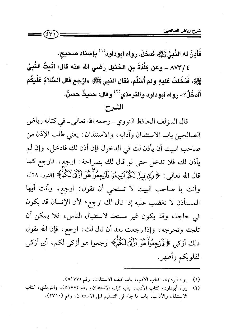 EXقال المؤلف رحمه الله في كتابه رياض الصالحين باب الاستئذان وآدابه والاستئذان يعني طلب الإذن أن تطلب من صاحب البيت أن يأذن لك في الدخول فإن أذن لك فادخل وإن لم يأذن لك فلا تدخل حتى لو قال لك بصراحة ارجع فارجع كما قال الله تعالى وإن قيل لكم ارجعوا فارجعوا هو أزكى لكم وأنت يا صاحب البيت لا تستح أن تقول ارجع وأنت أيها المستأذن لا تغضب عليه إذا قال: لك أرجع لأن الإنسان قد يكون في حاجة وقد يكون غير مستعد لاستقبال الناس فلا يمكن أن تلجئه وتحرجه وإذا رجعت بعد أن قال لك: ارجع فإن الله يقول ذلك هو أزكى لك {فارجعوا هو أزكى لكم} أي أزكى لقلوبكم وأطهر
