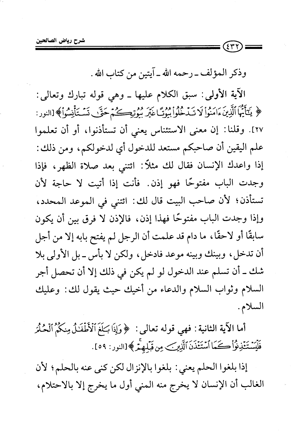 وذكر المؤلف رحمه الله آيتين من كتاب الله الآية الأولى وقد سبق الكلام عليها وهي قوله تعالى {يا أيها الذين آمنوا لا تدخلوا بيوتا غير بيوتكم حتى تستأنسوا} وقلنا إن معنى الاستئناس يعني أن تستأذنوا أو أن تعلموا علم اليقين أن صاحبكم مستعد لدخولكم ومن ذلك إذا واعدك الإنسان قال لك مثلا ائتني بعد صلاة الظهر فإذا وجدت الباب مفتوحا فهو أذن فأنت إذا أتيت لا حاجة لأن تستأذن لأن صاحب البيت قال لك ائتني في الموعد المحدد فإذا وجدت الباب مفتوحا فهذا إذن فالإذن لا فرق بين أن يكون سابقا أو لاحقا مادام قد علمت أن الرجل لم يفتح بابه إلا من أجل أن تدخل وبينك وبينه موعد فادخل ولكن لا بأس بل الأولى بلا شك أن تسلم عند الدخول لو لم يكن في ذلك إلا أن تحصل أجر السلام وثوابه والدعاء من أخيك حيث يقول لك وعليك السلام أما الآية الثانية فهي قوله تعالى {وإذا بلغ الأطفال منكم الحلم فليستأذنوا كما استأذن الذين من قبلهم} إذا بلغوا الحلم يعني بلغوا بالإنزال لكن كني عنه بالحلم لأن الغالب أن الإنسان لا يخرج منه المني أول ما يخرج إلا بالاحتلام
