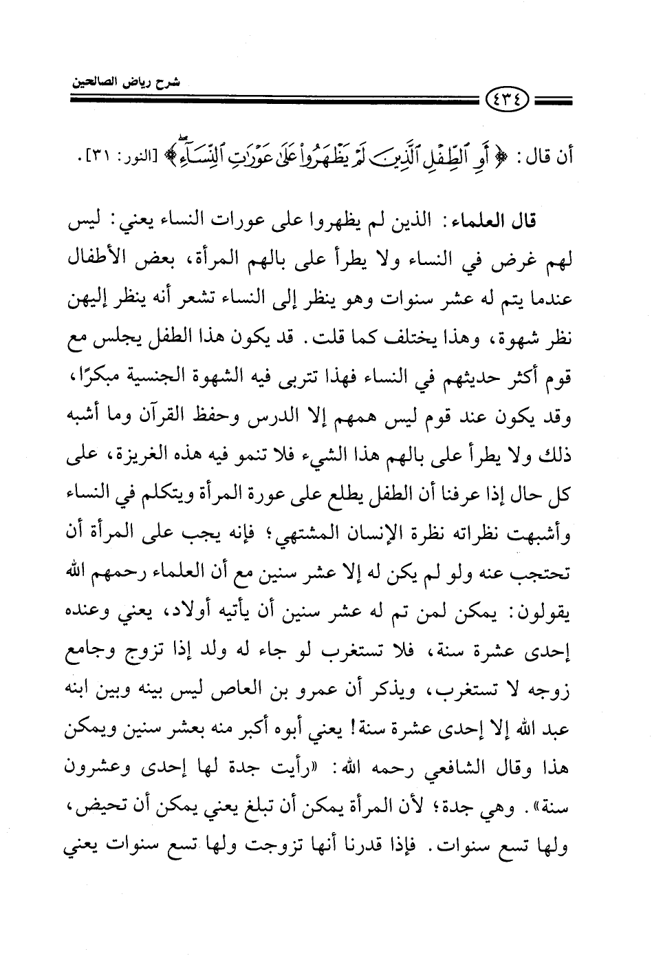 أن قال {أو الطفل الذين لم يظهروا على عورات النساء} قال العلماء الذين لم يظهروا على عورات النساء يعني ليس لهم غرض في النساء ولا يسري على بالهم المرأة بعض الأطفال من حين ما يتم له عشر سنوات وهو ينظر إلى النساء نظر شهوة وهذا يختلف كما قلت قد يكون هذا الطفل يجلس مع قوم أكثر حديثهم في النساء فهذا تتربى فيه الشهوة الجنسية من البداية وقد يكون عند قوم ليس همهم إلا الدرس وحفظ القرآن وما أشبه ذلك ولا يسري على بالهم هذا الشيء فلا تنمو فيه هذه الغريزة على كل حال فإذا عرفنا أن الطفل يطلع على عورة المرأة ويتكلم في النساء وأشبهت نظراته نظرة الإنسان المشتهي فإنه يجب على المرأة أن تحتجب عنه ولو لم يكن له إلا عشر سنين مع أن العلماء رحمهم الله يقولون يمكن لمن تم له عشر سنين أن يأتي له أولاد يعني وعنده (11) سنة فلا تستغرب إذا جاء له ولد إذا تزوج وجامع زوجه فلا تستغرب ويذكر أن عمرو بن العاص ليس بينه وبين ابنه عبد الله إلا إحدى عشرة سنة وقال الشافعي رحمه الله رأيت جدة لها إحدى وعشرون سنة عندنا الآن تبلغ الواحد والعشرين وما تزوجت حتى الآن لأن المرأة يمكن أن تبلغ تحيض ولها تسع سنوات فإذا قدرنا أنها تزوجت ولها تسع سنوات يعني