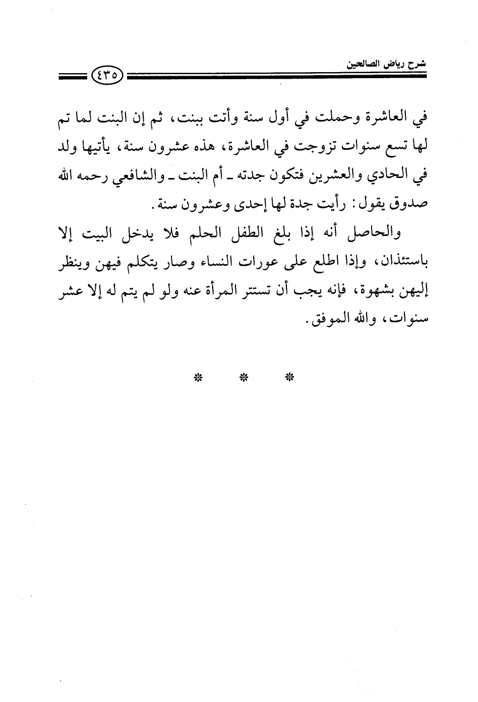 في العاشرة وحملت في أول سنة وأتت ببنت ثم إن البنت لما تم لها تسع سنوات تزوجت في العاشرة كم هكذا (20) سنة يأتيها ولد في الحادي والعشرين فتكون جدته أم البنت والشافعي رحمه الله صدوق يقول رأيت جدة لها إحدى وعشرون سنة والحاصل أنه إذا بلغ الطفل الحلم فلا يدخل البيت إلا باستئذان وإذا اطلع على عورات النساء وصار يتكلم فيهن وينظر إليهن بشهوة فإنه يجب أن تستتر عنه المرأة ولم لو يتم له إلا عشر سنوات والله الموفق