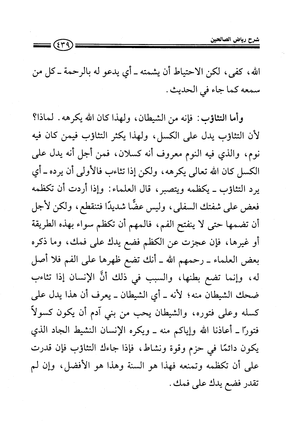 الله كفي لكن الاحتياط أن يشمته أي يدعو له بالرحمة كل من سمعه كما جاء في الحديث وأما التثاؤب فإنه من الشيطان ولهذا كان الله يكرهه لماذا لأن التثاؤب يدل على الكسل ولهذا يكثر التثاؤب فيمن كان فيه نوم ولأجل أنه يدل على الكسل كان الله يكرهه ولكن إذا تثاءب فالأولى أن يرده أي يرد التثاؤب يكظمه ويتصبر قال العلماء وإذا أردت أن تكظمه فعض على شفتك السفلى وليس عضا شديدا فتنقطع ولكن لأجل أن تضمها حتى لا ينفتح الفم فالمهم أن تكظم سواء بهذه الطريقة أو غيرها فإن عجزت عن الكظم فضع يدك على فمك وما ذكره بعض العلماء رحمهم الله أنك تضع ظهرها على الفم فلا أصل له وإنما تضع بطنها تسد الفم والسبب في ذلك أن الإنسان إذا تثاءب ضحك الشيطان منه لأنه أي الشيطان يعرف أن هذا يدل على كسله وعلى فتوره والشيطان يحب من بني آدم أن يكون كسولا فتورا أعاذنا الله وإياكم منه ويكره الإنسان النشيط الجاد الذي يكون دائما في حزم وقوة ونشاط فإذا جاءك التثاؤب فإن استطعت أن تكظمه وتمنعه فهذا هو السنة وهذا هو الأفضل وإن لم تقدر فضع يدك على فمك