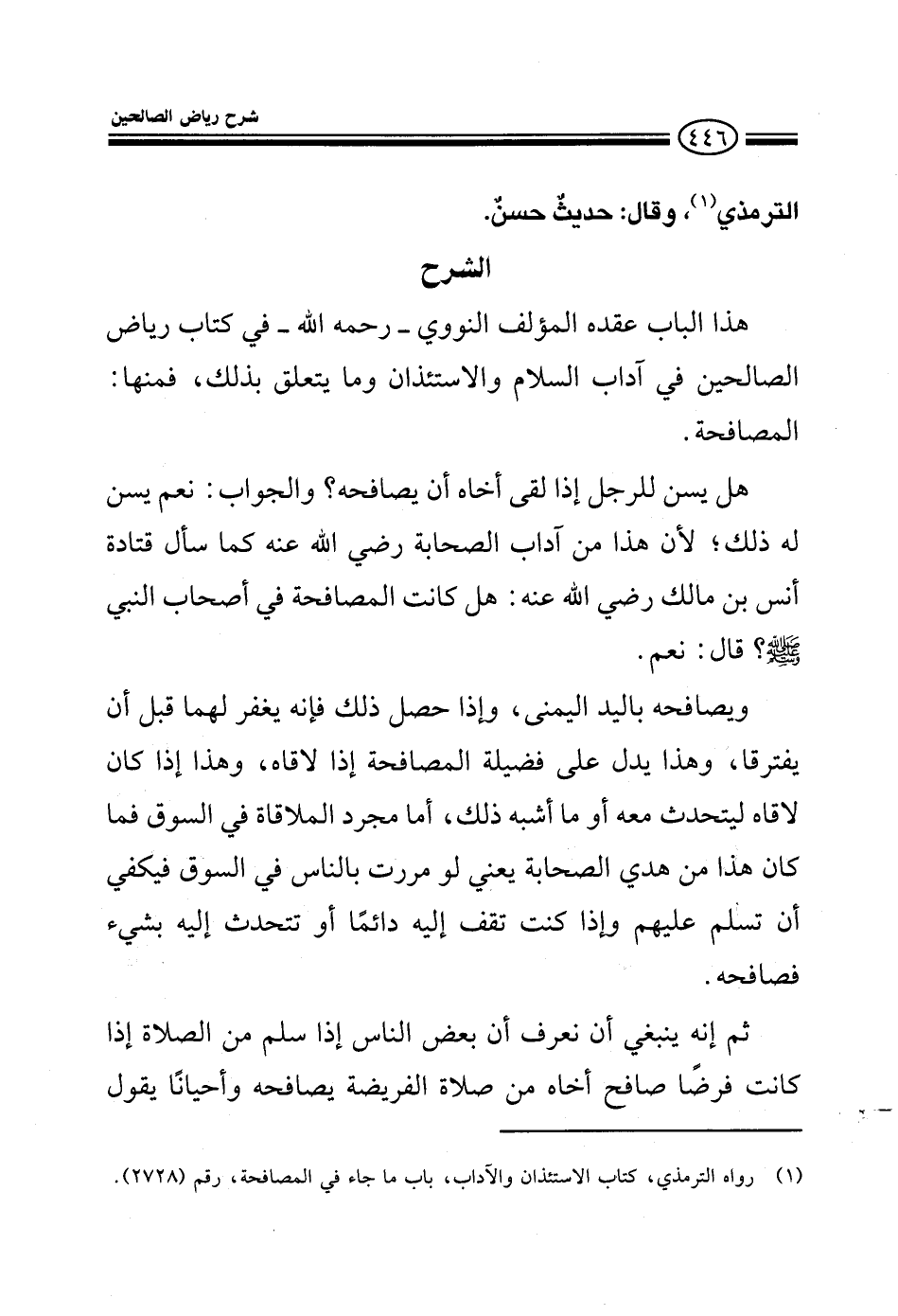 EXهذا الباب عقده المؤلف النووي رحمه الله في كتاب رياض الصالحين بآداب السلام والاستئذان وما يتعلق بذلك فمنها: المصافحة هل يسن للرجل إذا لقي أخاه أن يصافحه والجواب نعم يسن له ذلك لأن هذا من آداب الصحابة رضي الله عنهم كما سأل قتادة أنس بن مالك رضي الله عنه هل كانت المصافحة في أصحاب النبي صلى الله عليه وسلم قال نعم ويصافحه باليد اليمنى وإذا حصل ذلك فإنه يغفر لهما قبل أن يفترقا وهذا يدل على فضيلة المصافحة إذا لاقاه وهذا إذا كان لاقاه ليتحدث معه أو ما أشبه ذلك أما مجرد الملاقاه في السوق فما كان هذا من هدي الصحابة يعني إذا مررت بالناس في السوق يكفي أن يسلم عليهم وإذا كنت تقف إليه دائما وتتحدث إليه بشيء فصافحه ثم ينبغي أن نعرف أن بعض الناس إذا سلم من الصلاة إذا كانت فرضا صافح أخاه وأحيانا يقول