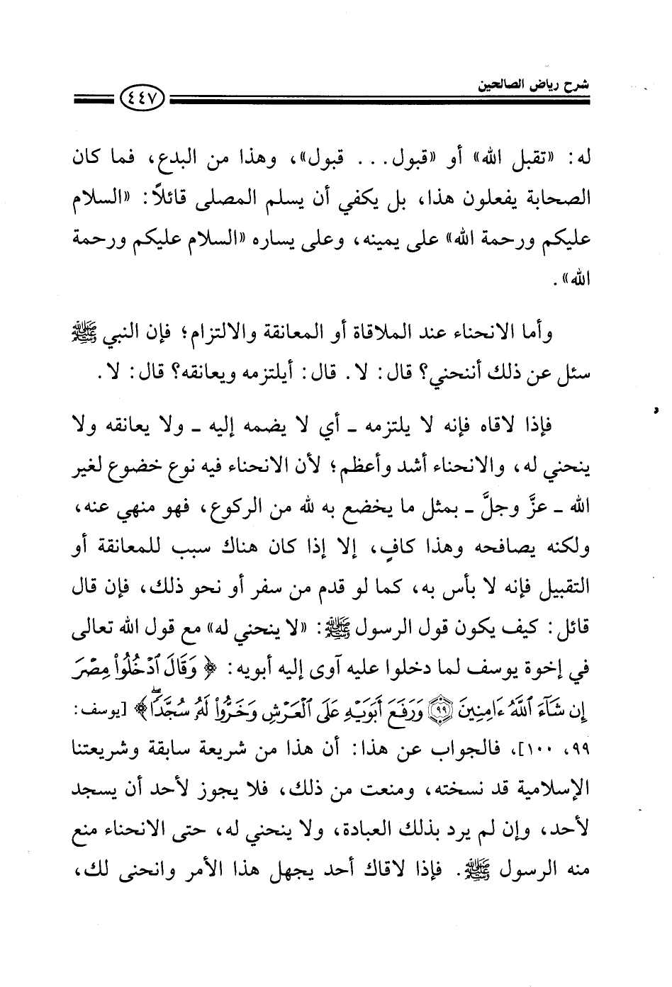 قبول وهذا من البدع فما كان الصحابة يفعلون هذا وإنما يكفي أن يسلم المصلي عن يمينه وعن يساره السلام عليكم ورحمة الله وأما الانحناء عند الملاقاة أو المعانقة والالتزام فإن النبي صلى الله عليه وسلم سئل عن ذلك أننحني قال لا قال السائل أيلتزمه ويعانقه قال لا فإذا لاقاه فإنه لا يلتزم أي لا يضمه إليه ولا يعانقه ولا ينحني له والانحناء أشد وأعظم لأن فيه نوعا من الخضوع لغير الله عز وجل بمثل ما يفعل لله في الركوع فهو منهي عنه ولكنه يصافحه وهذا كاف إلا إذا كان هناك سبب فإن المعانقة أو التقبيل لا بأس به كأن كان قادما من سفر أو نحو ذلك فإن قال قائل كيف يكون قول الرسول صلى الله عليه وسلم لا ينحني له مع قول الله تعالى في إخوة يوسف لما دخلوا عليه وقال ادخلوا مصر إن شاء الله آمنين ورفع أبويه على العرش وخروا له سجدا فالجواب عن هذا أنه في شريعة سابقة وشريعتنا الإسلامية قد نسخته ومنعت منه فلا يجوز لأحد أن يسجد لأحد وإن لم يرد بذلك العبادة أو ينحني فإن الانحناء منع منه الرسول صلى الله عليه وسلم إذا قابلك أحد يجهل هذا الأمر وانحنى لك
