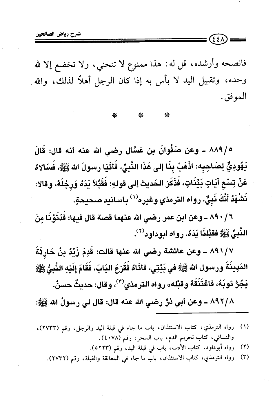 889 - وعن صفوان بن عسال رضي الله عنه قال قال يهودي لصاحبه اذهب بنا إلى هذا النبي فأتيا رسول الله صلى الله عليه وسلم فسألاه عن تسع آيات بينات فذكر الحديث إلى قوله فقبلا يده ورجله وقالا نشهد أنك نبي رواه الترمذي وغيره بأسانيد صحيحة
