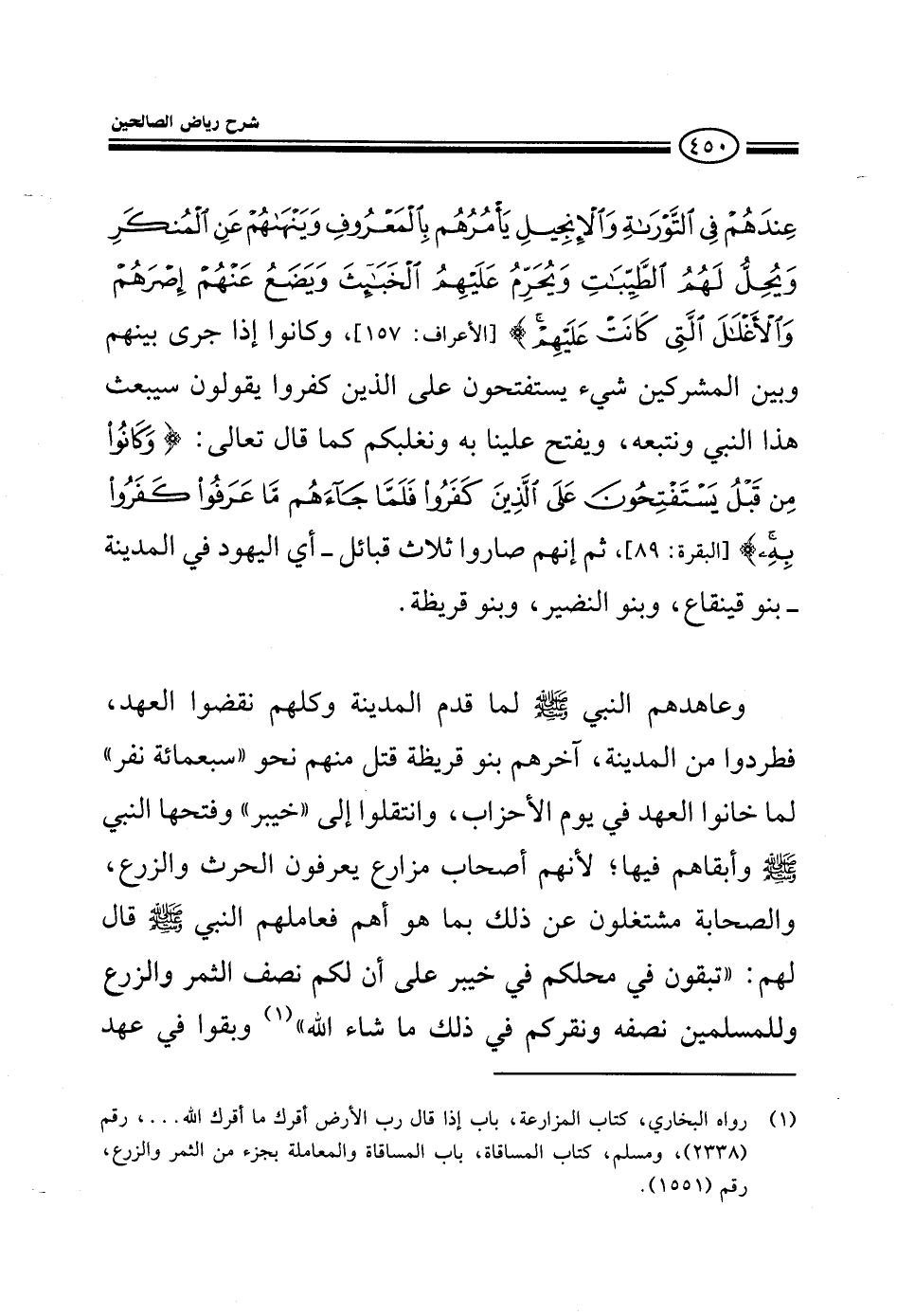 عندهم في التوراة والإنجيل يأمرهم بالمعروف وينهاهم عن المنكر ويحل لهم الطيبات ويحرم عليهم الخبائث ويضع عنهم إصرهم والأغلال التي كانت عليهم} وكانوا إذا جرى بينهم وبين المشركين شيء يستفتحون على الذين كفروا يقولون سيبعث نبي ونتبعه ونستفتح به ونغلبكم كما قال تعالى {وكانوا من قبل يستفتحون على الذين كفروا فلما جاءهم ما عرفوا كفروا به} ثم إنهم صاروا ثلاث قبائل أي اليهود في المدينة بنو قينقاع وبنو النضر وبنو قريظة وعاهدهم النبي صلى الله عليه وسلم لما قدم المدينة وكلهم نقضوا العهد فطردوا منها آخرهم بنو قريظة قتل منهم نحو سبعمائة نفر لما خانوا العهد في يوم الأحزاب وانتقلوا إلى خيبر وفتحها النبي صلى الله عليه وسلم وأبقاهم فيها لأنهم أصحاب مزارع يعرفون الحرث والزرع والصحابة مشتغلون عن ذلك بما هو أهم فعاملهم النبي صلى الله عليه وسلم قال لهم تبقون في محلكم خيبر على أن لكم نصف الثمر والزرع وللمسلمين نصفهما ونقركم في ذلك ما شاء الله وبقوا في عهد