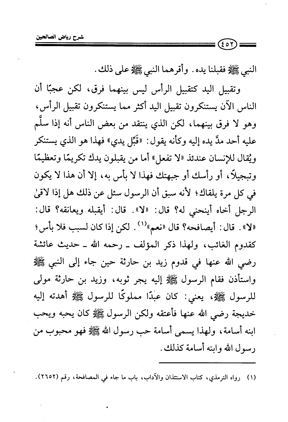 النبي صلى الله عليه وسلم فقبلنا يده وأقرهما النبي صلى الله عليه وسلم على ذلك وتقبيل اليد كتقبيل الرأس ليس بينهما فرق لكن عجبا أن الناس الآن يستنكرون تقبيل اليد أكثر من استنكارهم تقبيل الرأس وهو لا فرق بينهما لكن الذي ينتقد من بعض الناس أنه إذا سلم عليه أحد مد يده إليه وكأنه يقول قبل يدي فهذا هو الذي يستنكر ويقال للإنسان عندئذ لا تفعل أما من يقبل يدك تكريما وتعظيما أو رأسك أو جبهتك فهذا لا بأس به إلا أن هذا لا يكون في كل مرة يلقاك لأنه سبق أن الرسول صلى الله عليه وسلم سئل عن ذلك إذا لاقى الرجل أخاه أينحني له؟ قال لا قال أيقبله ويعانقه قال لا قال أيصافحه؟ قال نعم لكن إذا كان لسبب فلا بأس للغائب ولهذا يذكر المؤلف رحمه الله حديث عائشة في قدوم زيد بن حارثة حين جاء إلى النبي صلى الله عليه وسلم واستأذن فقام الرسول صلى الله عليه وسلم إليه يجر ثوبه وزيد بن حارثة مولى الرسول صلى الله عليه وسلم أي كان عبدا مملوكا للرسول صلى الله عليه وسلم أهدته إليه خديجة رضي الله عنها فأعتقه ولكن الرسول صلى الله عليه وسلم كان يحبه ويحب ابنه أسامة ولهذا يسمى أسامة الحب بن الحب فهو محبوب لرسول الله صلى الله عليه وسلم وابنه أسامة كذلك المهم