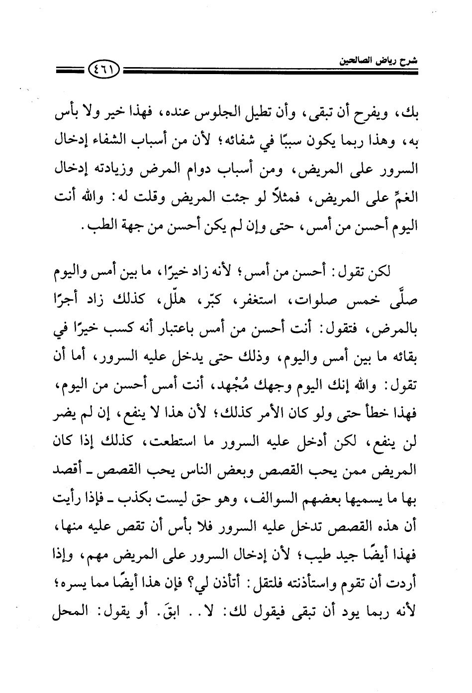 بك ويفرح أن تبقي وأن تطيل الجلوس عنده فهذا خير ولا بأس به وهذا ربما يكون سببا في شفائه لأن من أسباب الشفاء إدخال السرور على المريض ومن أسباب دوام المرض وزيادته إدخال الغم عليه فمثلا إذا جئت مريضا وقلت له أنت اليوم أحسن من أمس حتى وإن لم يكن أحسن من جهة المرض لكن تقول أحسن من أمس لأنك زدت خيرا ما بين أمس واليوم صليت خمس صلوات استغفرت هللت كذلك زاد أجرك بالمرض وذلك حتى يدخل عليه السرور ولا تقل له أنت أمس أحسن من اليوم فذا خطأ حتى ولو كان الأمر كذلك لأنه إن لم يضر لن ينفع كذلك إذا كان المريض ممن يحب القصص وهي حق وليست كذبا قصص حقيقية ليست مكذوبة وكان ذلك مدعاة لإدخال السرور عليه فهذا أيضا طيب لأن من المهم إدخال السرور على المريض وإذا أردت أن تقوم واستأذنت تقوم أتأذن لي فإن هذا أيضا مما يسره لأنه ربما يود أن تبقي فلا يأذن لك